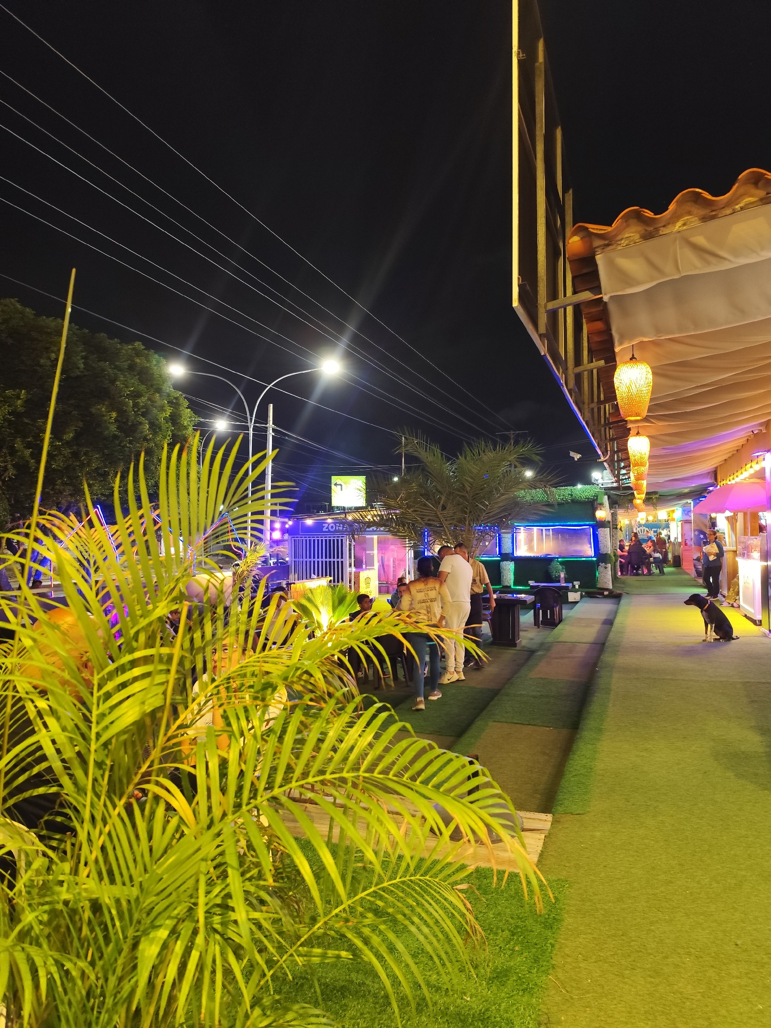 The image depicts a nighttime outdoor commercial and leisure area in Los Robles, Venezuela. A paved street on the left, illuminated by multiple overhead streetlights, runs parallel to a pedestrian pro…read more