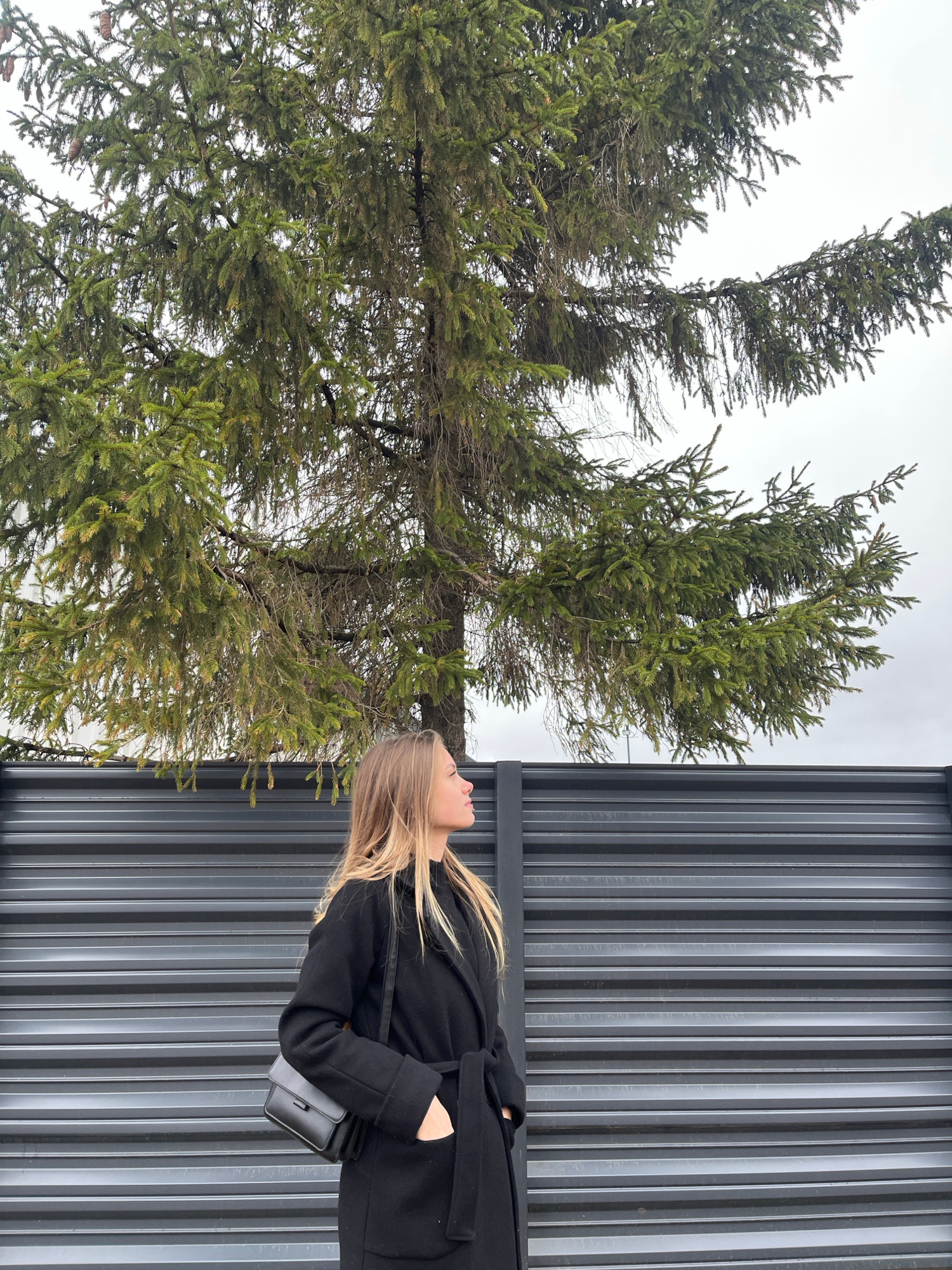 A woman in a black coat stands next to a dark, corrugated metal wall, looking up at a large evergreen tree against a pale, overcast sky. The tree dominates the left side of the image, its branches rea…read more