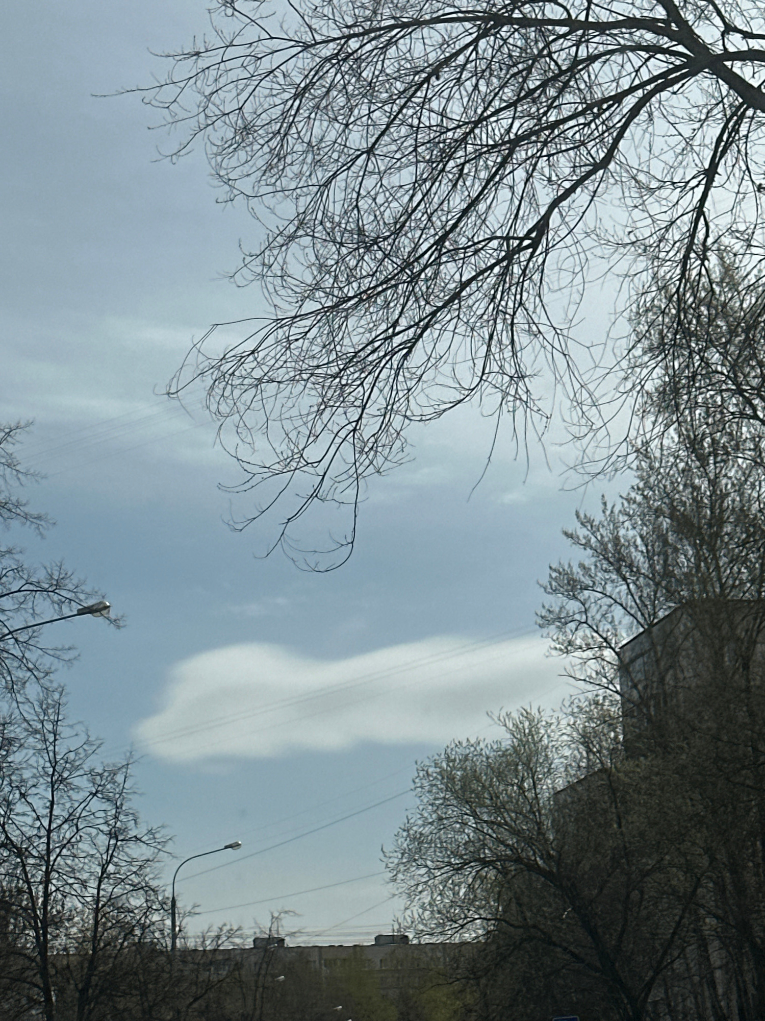 An upward-looking photograph captures a cloudy daytime sky framed by bare tree branches and urban structures in Moscow, Russia. The central area of the image is dominated by a light blue to greyish-bl…read more
