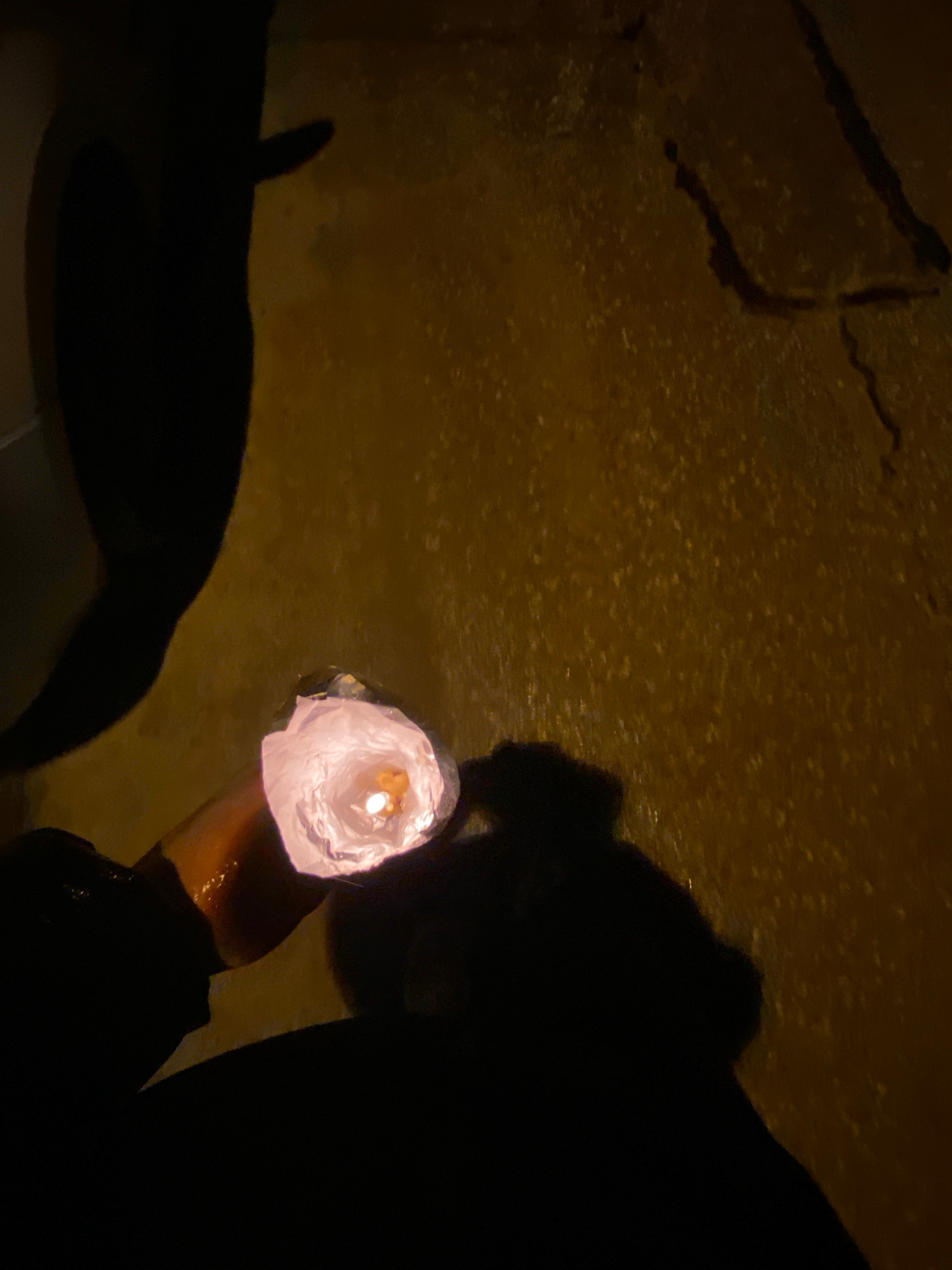 The image shows a hand holding a glowing, makeshift lantern inside what appears to be a dark, possibly underground, location. The light from the lantern illuminates part of the wall, revealing a rough…read more