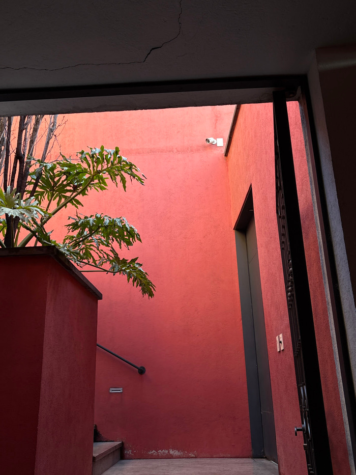 A view through a doorway reveals a courtyard with a vibrant red wall. A security camera is mounted high on the left wall. A black pipe runs diagonally across the wall, ending near a small, rectangular…read more