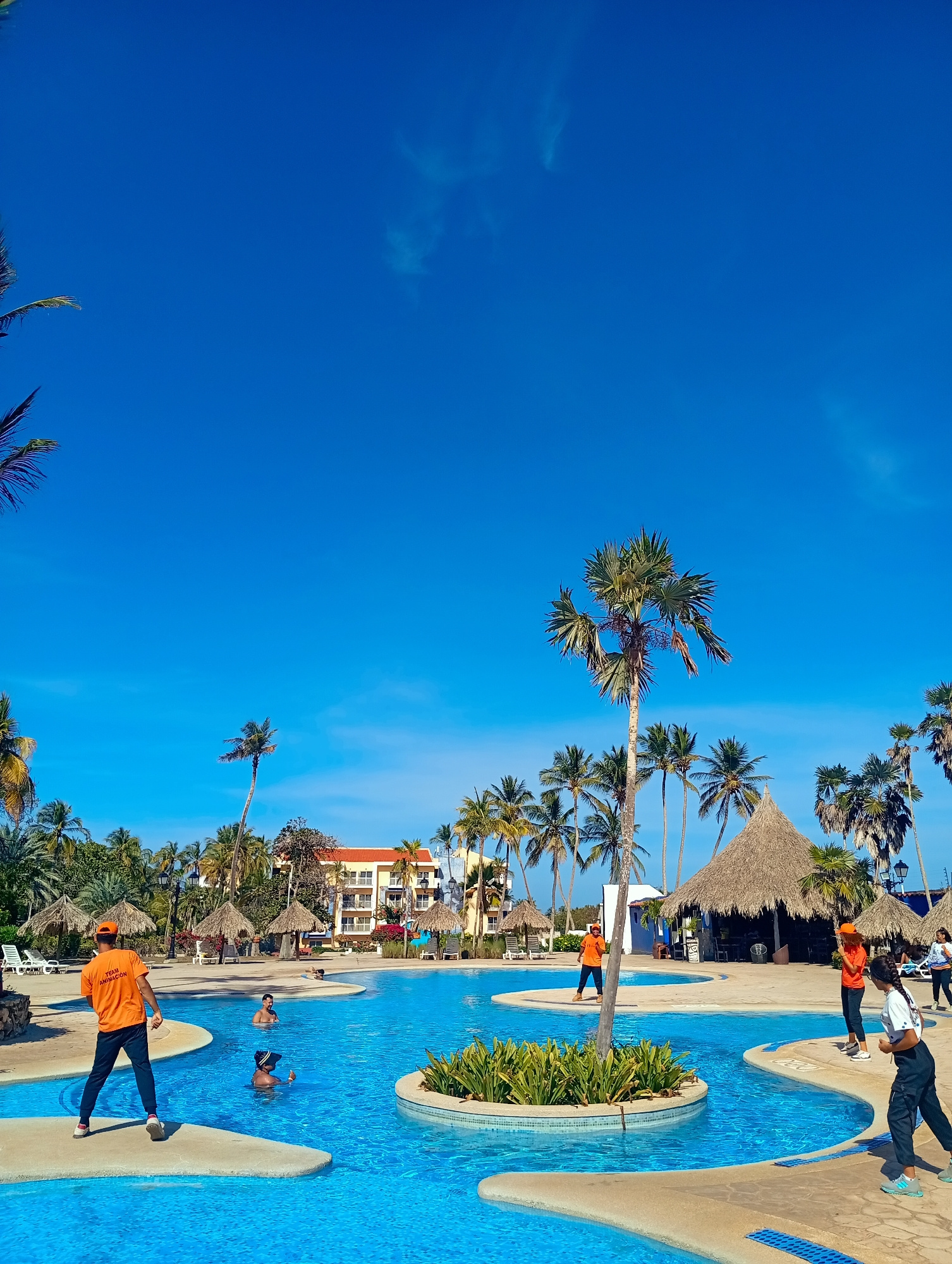 The image depicts a bright, sunny day at what appears to be a resort pool in Playa El Agua, Venezuela. The sky is a vibrant blue with scattered clouds. A large, multi-sectioned pool with varying depth…read more