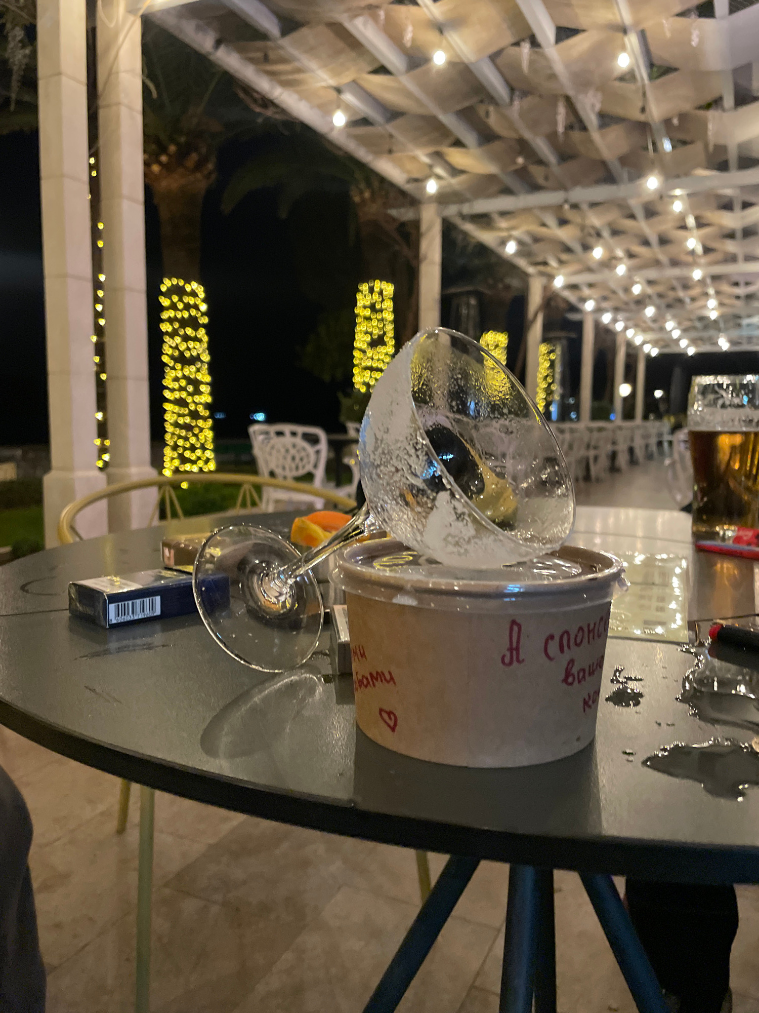 The image captures a nighttime scene in Rafailovići, Montenegro. A table is in focus, featuring a partially consumed martini in a frosted glass, a container with a red inscription in a Cyrillic script…read more