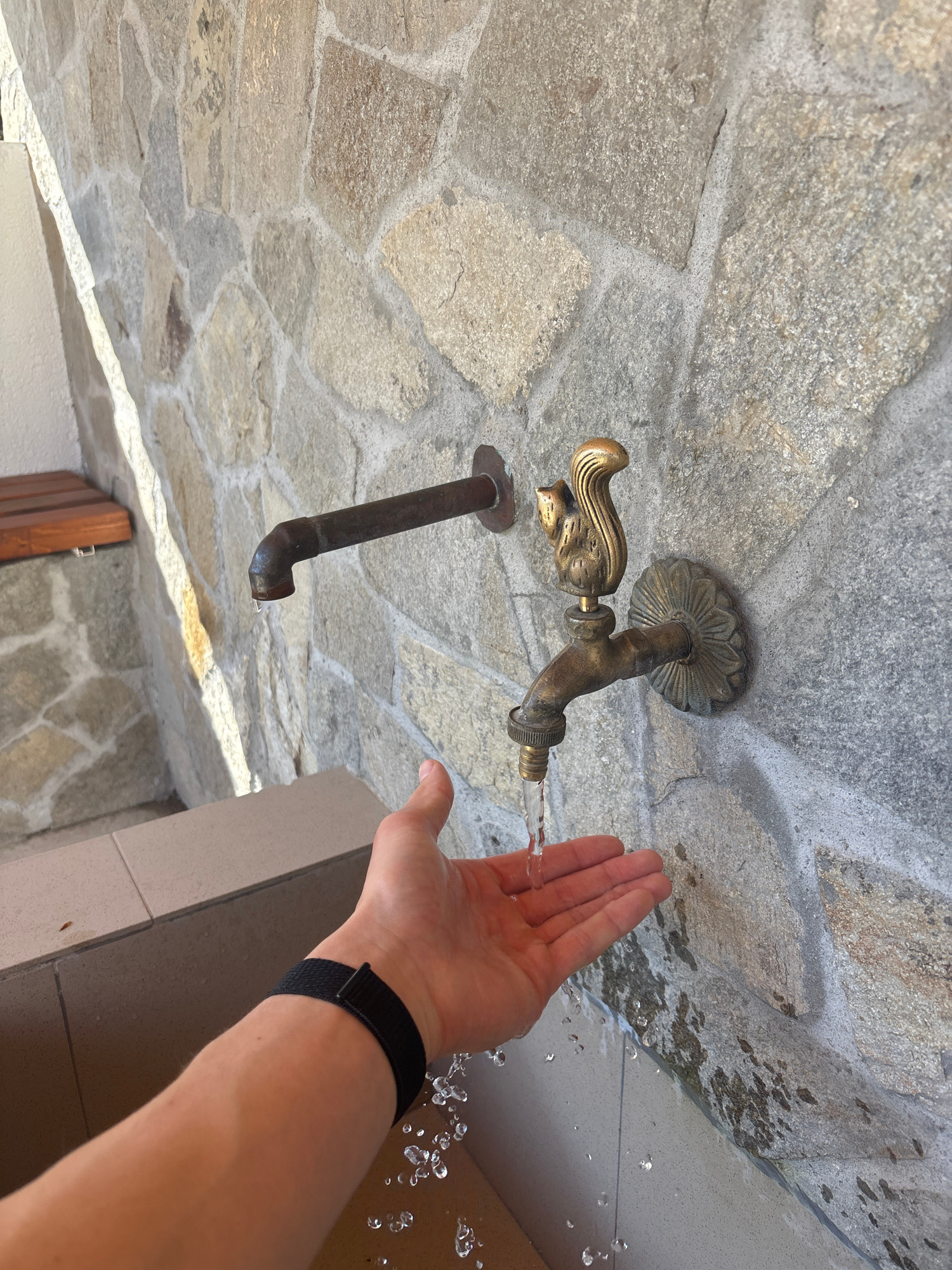 The image shows a person holding their hand under a decorative metal faucet attached to a stone wall. Water is flowing from the faucet into the person's hand, with droplets visible in the air around t…read more