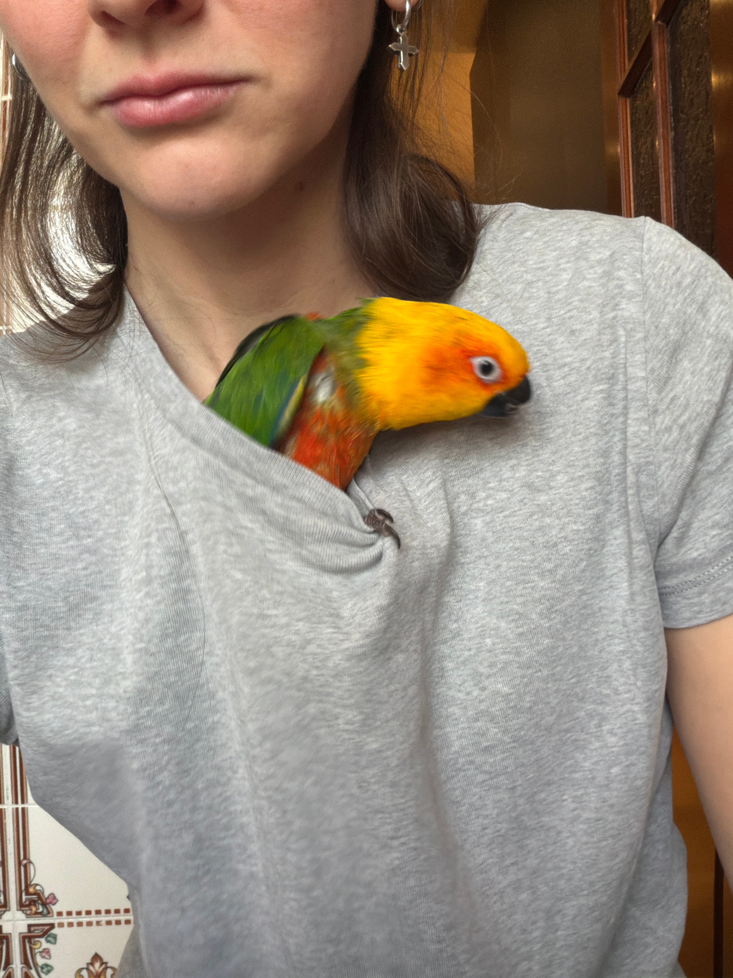 A person wearing a grey t-shirt is holding a sun conure parrot close to their body. The parrot's head and upper body are visible, showing its yellow, orange, and green feathers. The person's face and…read more