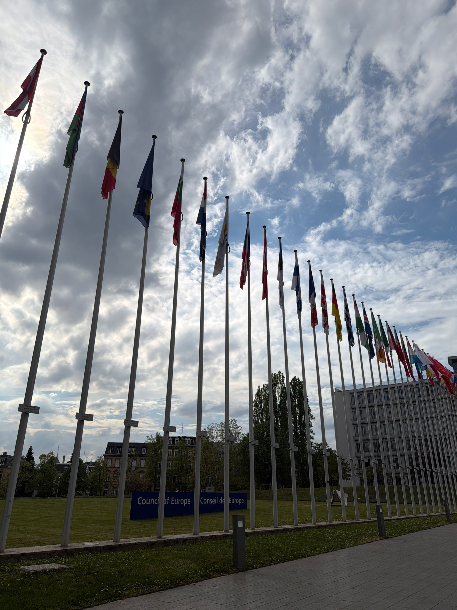 The image captures a striking view of numerous national flags displayed on tall flagpoles, set against a dramatic cloudy sky. The flags, in various colors such as red, white, blue, yellow, green, and…read more