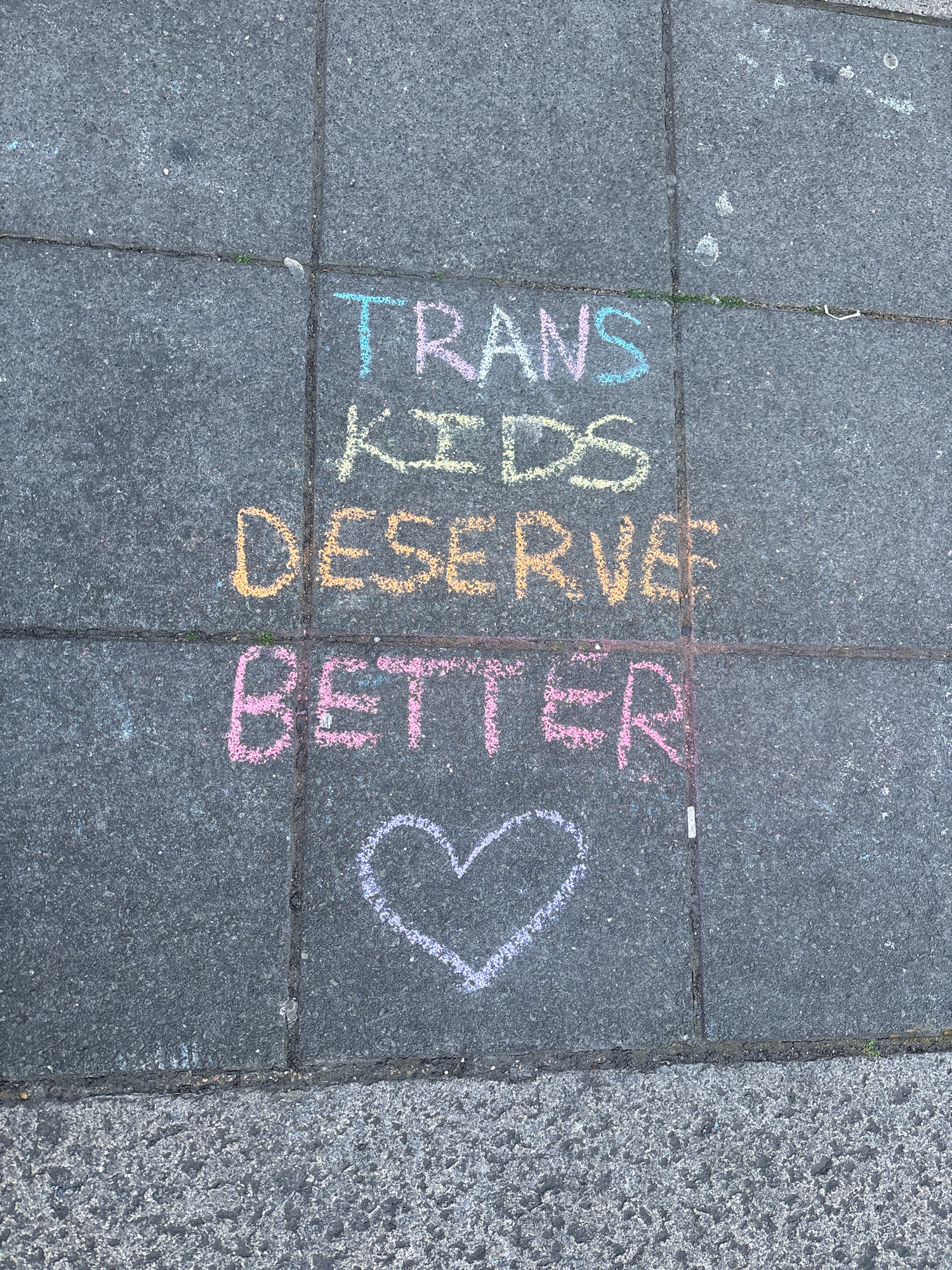 The image shows a section of a gray paved sidewalk in a city. The message "TRANS DESERVE BETTER" is written in colorful chalk on four adjacent paving stones. The letters are vertically oriented and st…read more
