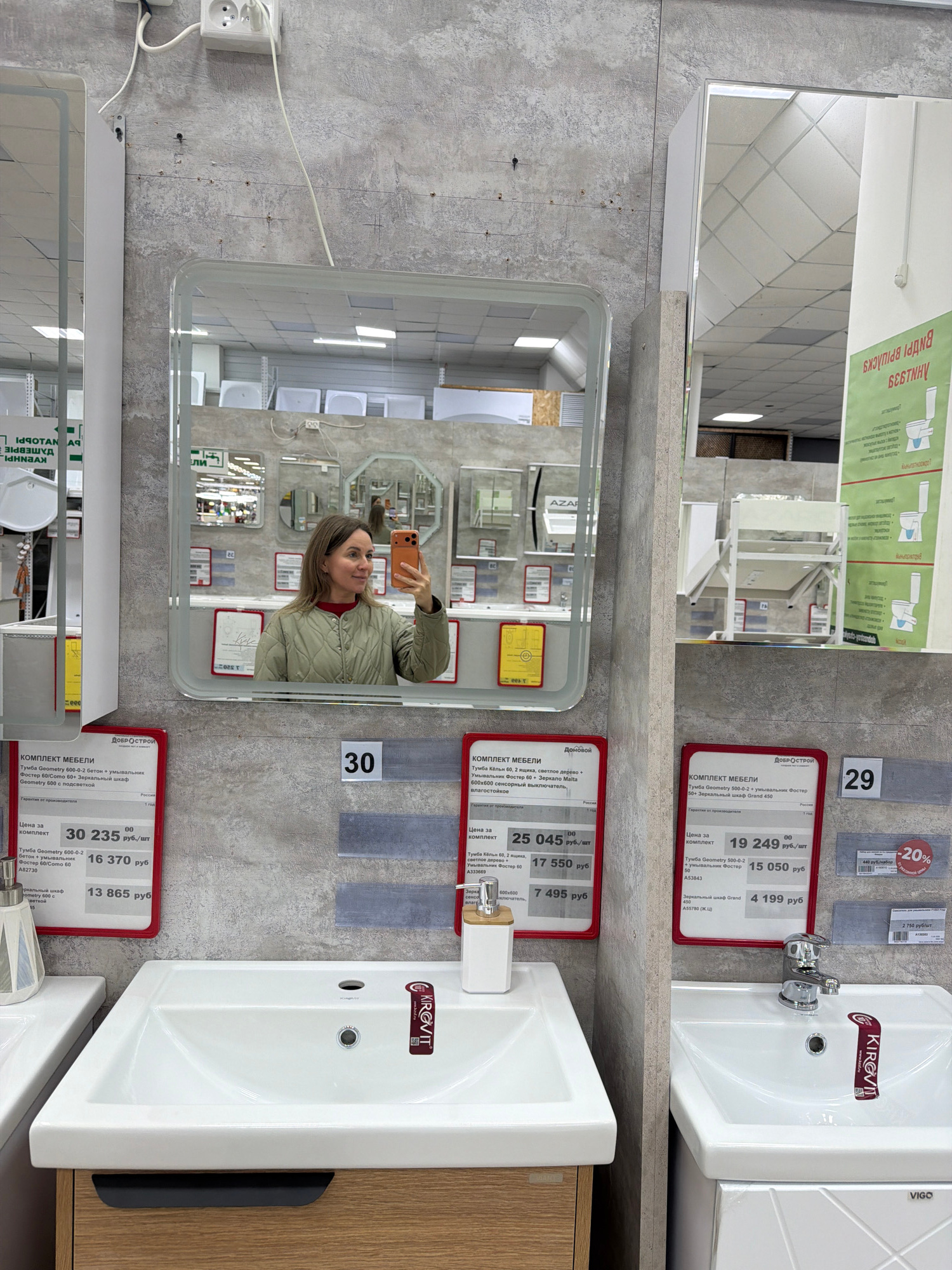 This image captures an indoor scene within a bathroom showroom or home improvement store, featuring several mirror and sink displays. The photograph is oriented vertically, rotated 90 degrees clockwis…read more