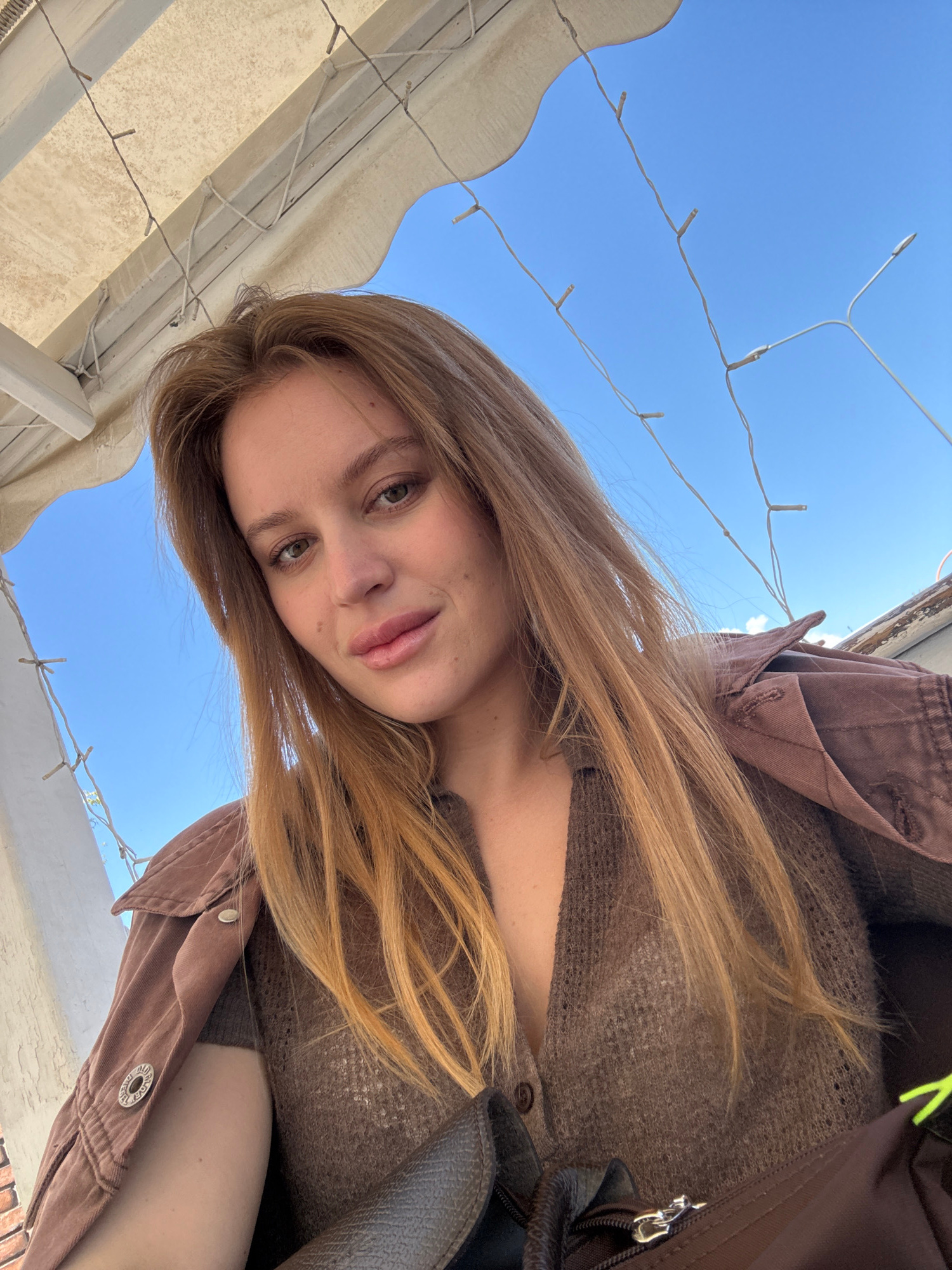 This media file presents an outdoor, low-angle portrait of a young woman against a clear blue sky. The woman, positioned at an angle, has long, light brown hair and green eyes, looking directly at the…read more