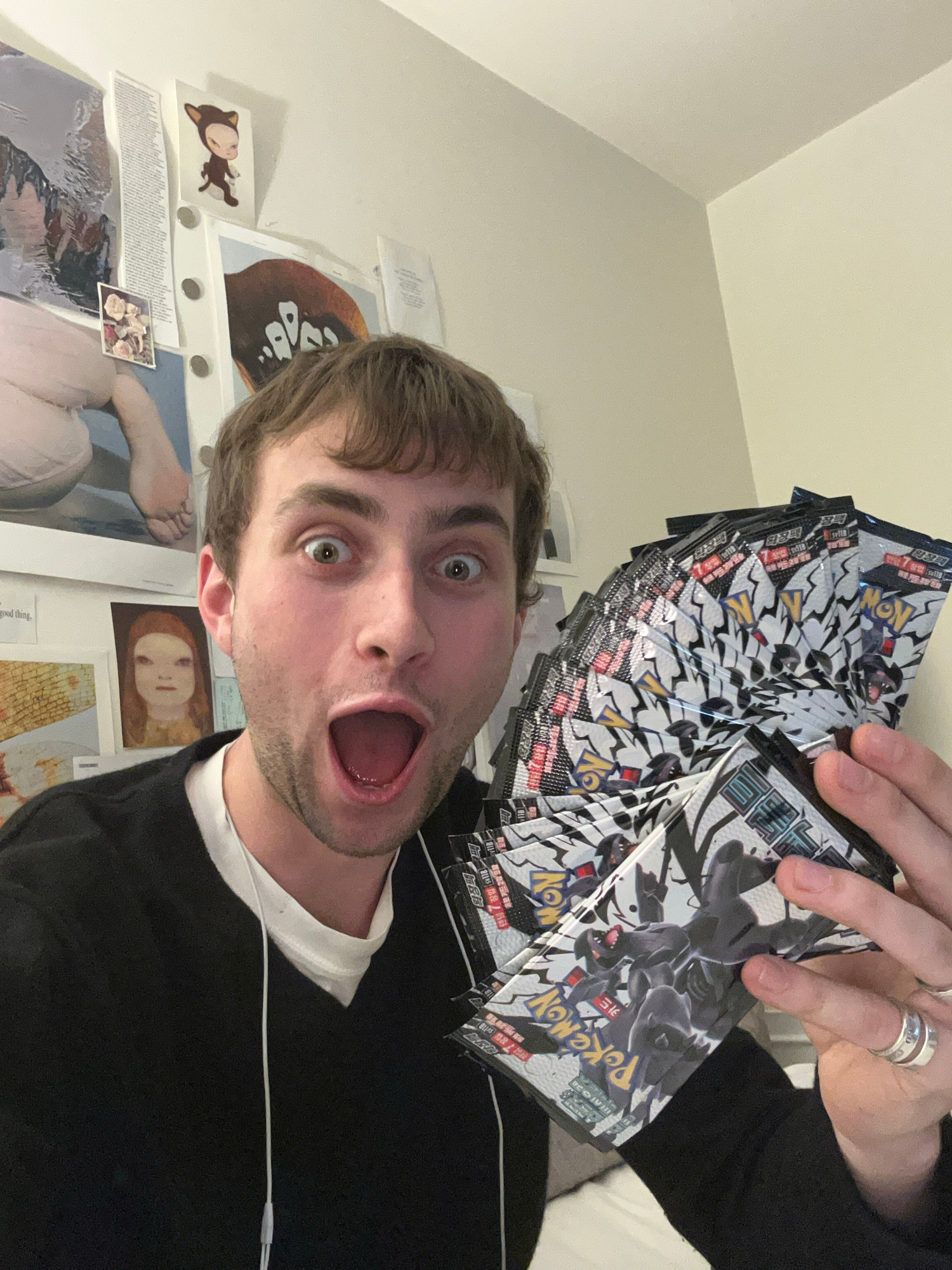 A selfie taken indoors, likely in a residential setting. A fair-skinned young man with short brown hair and wide eyes is holding a fan of unopened Pokémon trading card game booster packs in his right…read more