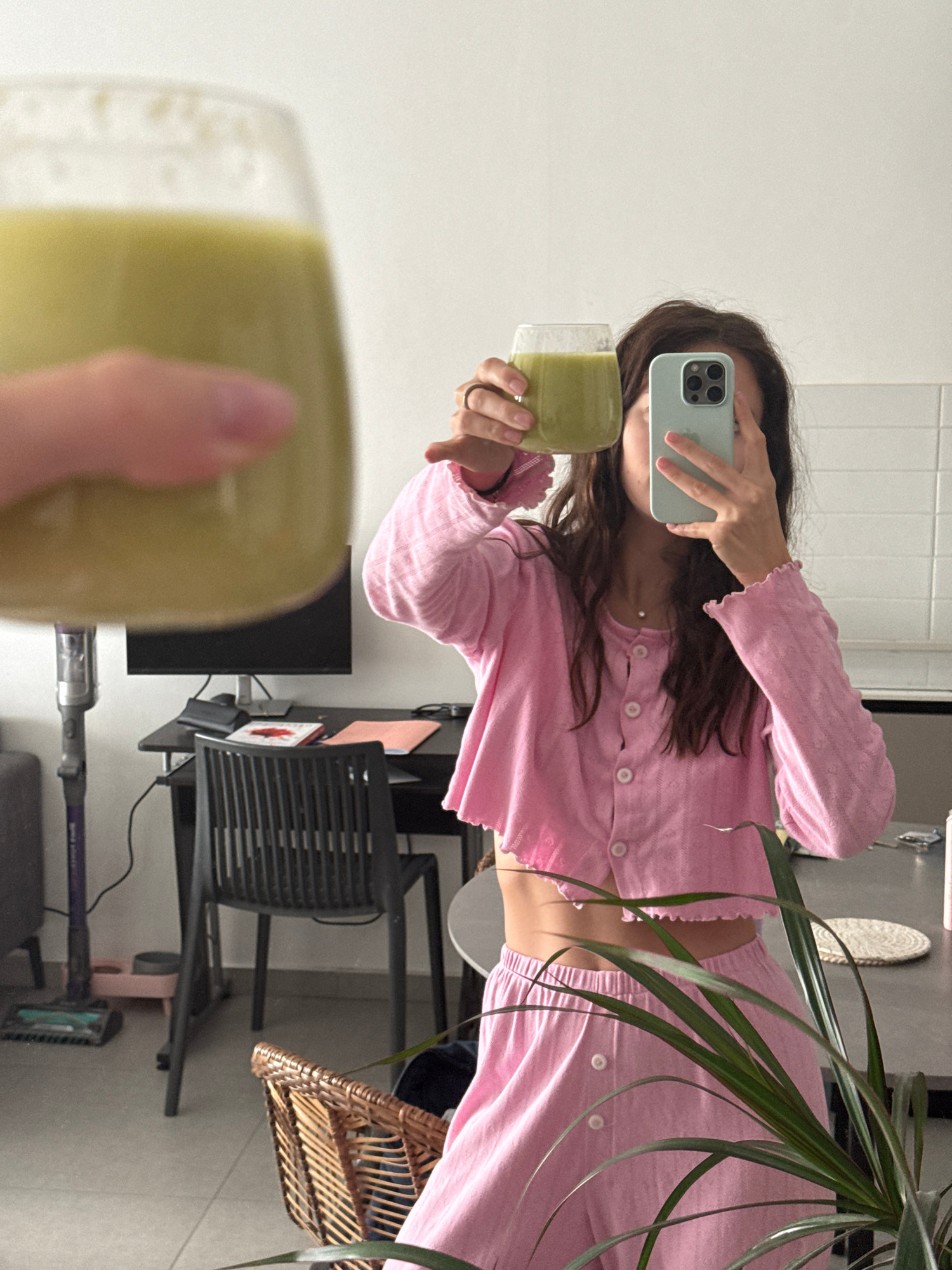 A person in pink loungewear is taking a selfie in a room. They are holding a glass of green liquid. The background includes a white tiled wall, a desk with a computer monitor, a chair, a plant, and a…read more