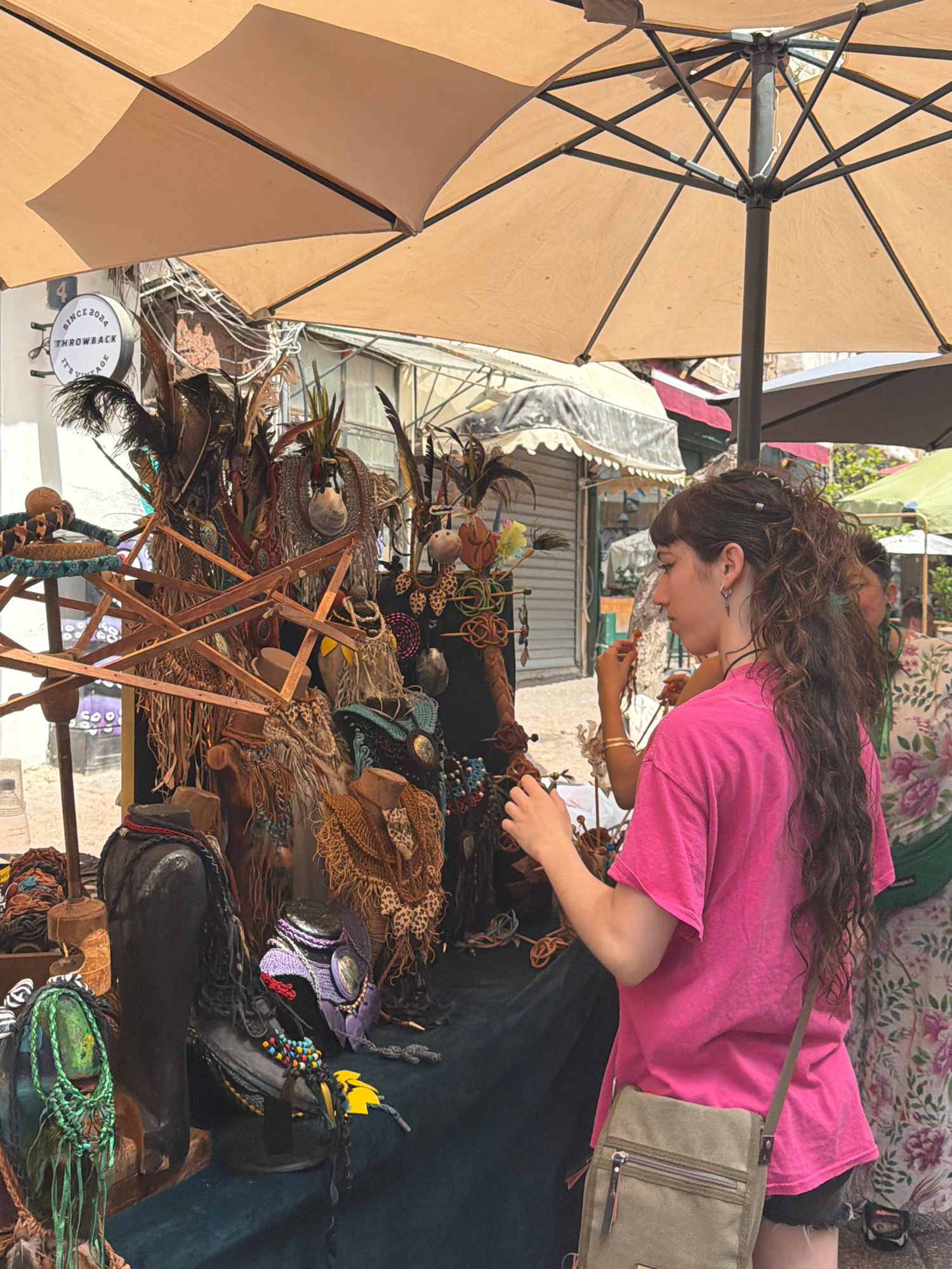 This media file captures a vibrant outdoor market scene, likely in Tel-Aviv, Israel, under bright daylight. The main subject is a young woman with long, dark, curly hair, wearing a bright pink t-shirt…read more