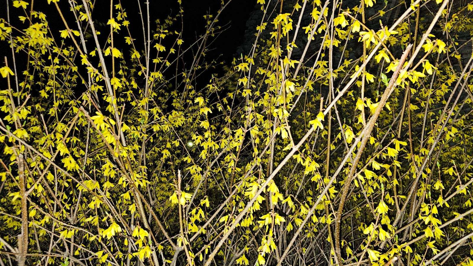 The image shows a close-up view of a forsythia bush in full bloom at night. The background is dark. The location is likely in the city of Hisarya, Bulgaria. The bush is densely packed with bright yell…read more