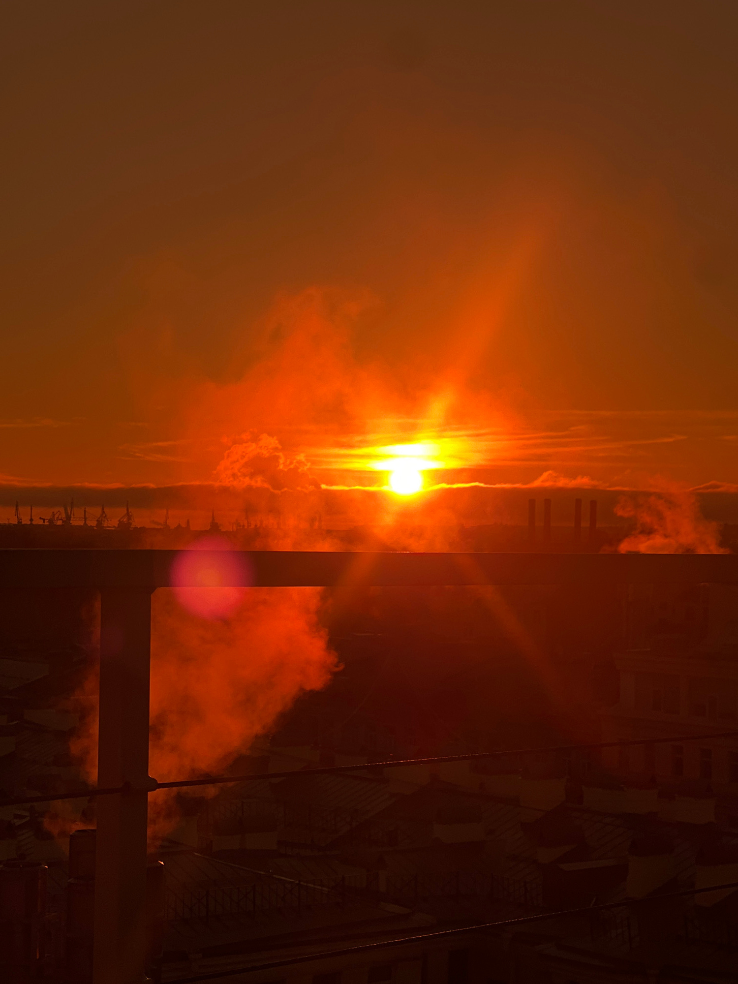 A photograph shows a horizontal view of a fiery sky during a sunset in Saint Petersburg, Russia. The sun, a bright white and yellow orb, is situated near the center, radiating intense orange and yelloβ¦read more