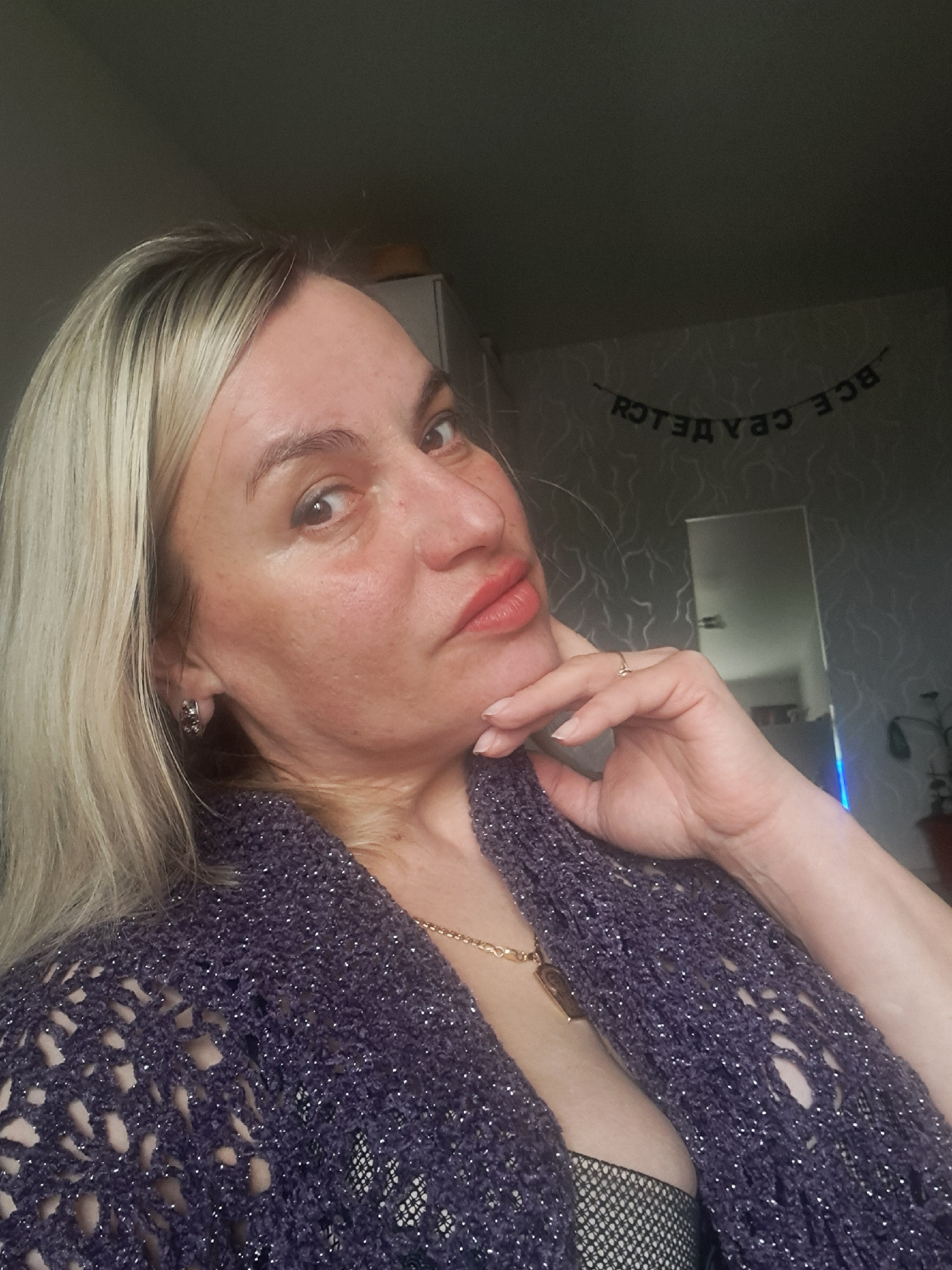 A close-up portrait shows a woman with long, straight blonde hair, possibly highlighted, looking directly at the camera. Her lips are painted a reddish-pink, and her expression is neutral to contempla…read more
