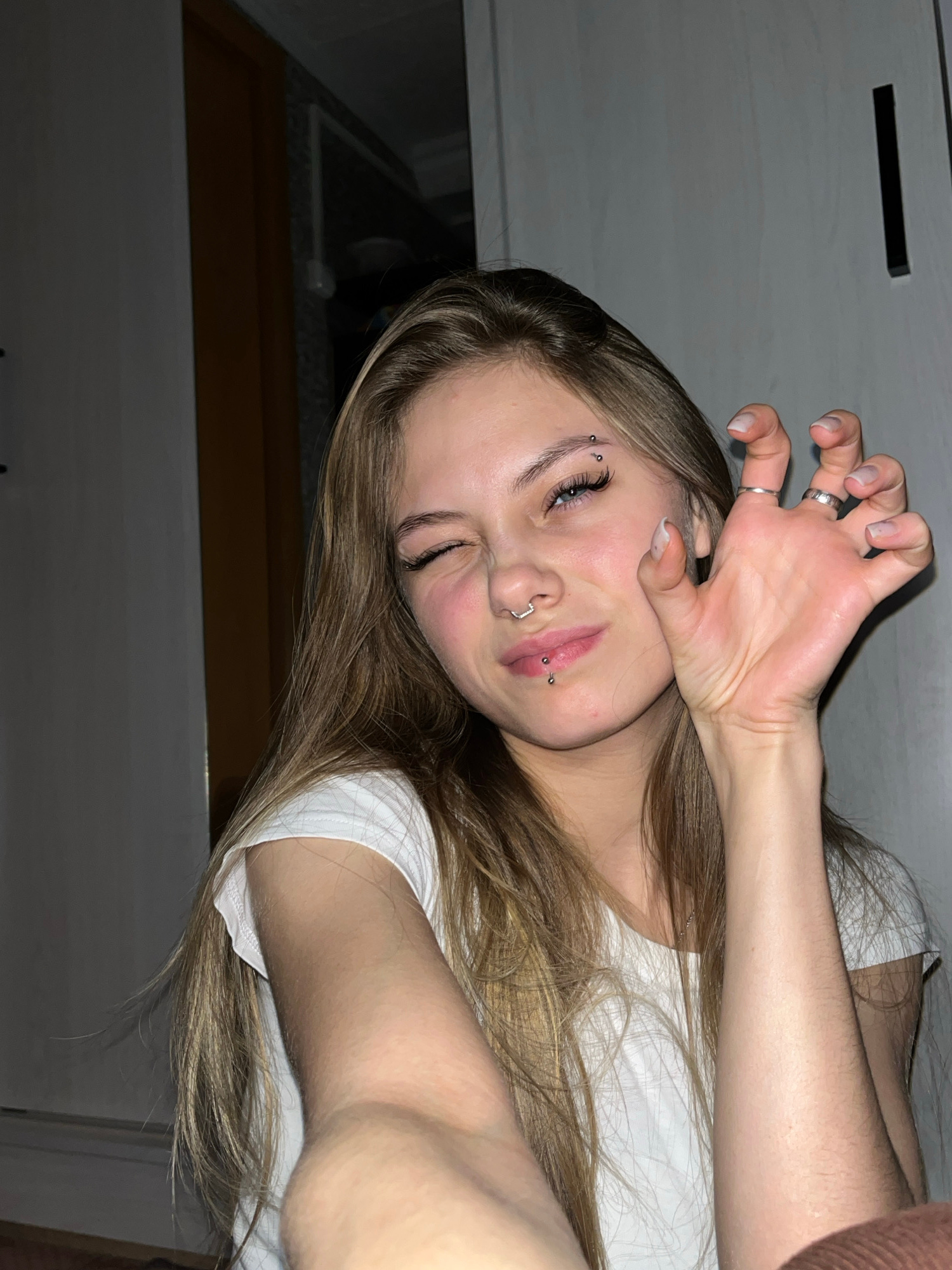 A young woman with long, light brown hair lies on her side, facing the camera. She wears a white t-shirt. Her left eye is closed while the right eye is partially open. Her left hand is raised, with he…read more