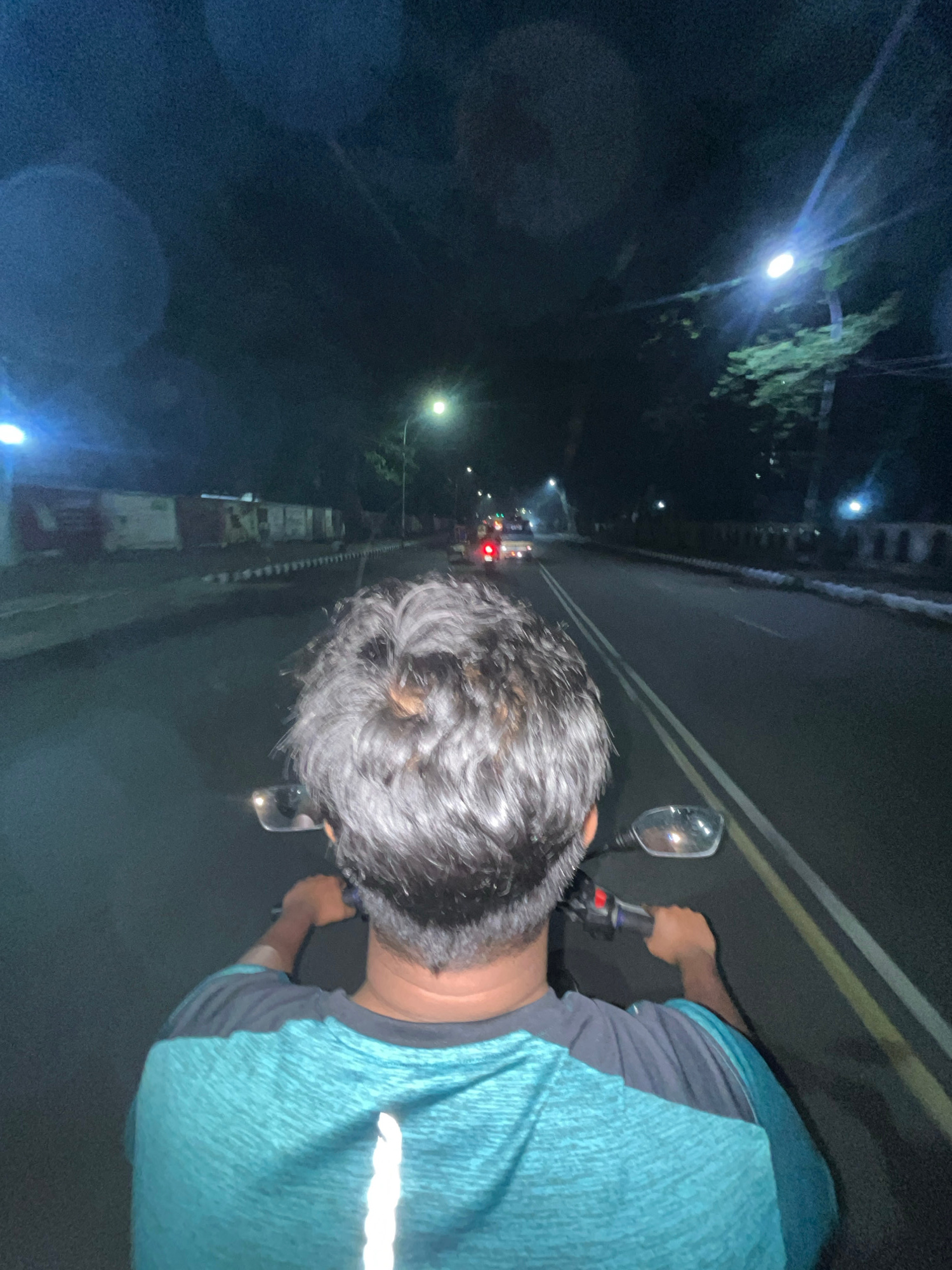 The image shows a person riding a motorcycle at night. The scene appears to be along a road in the city of Dhaka, Bangladesh, based on the presence of streetlights, buildings, and other vehicles. The…read more