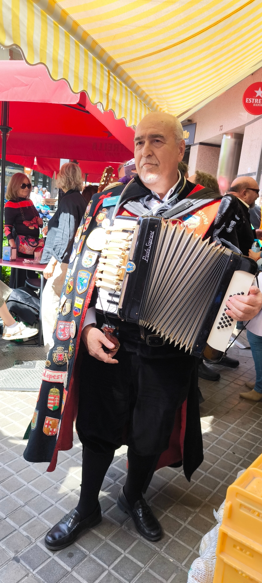 A medium shot depicts a man wearing an accordion and a cape adorned with badges and coats of arms. He has a fair complexion, a white mustache, and a balding head. The accordion is a black Paolo Sopran…read more