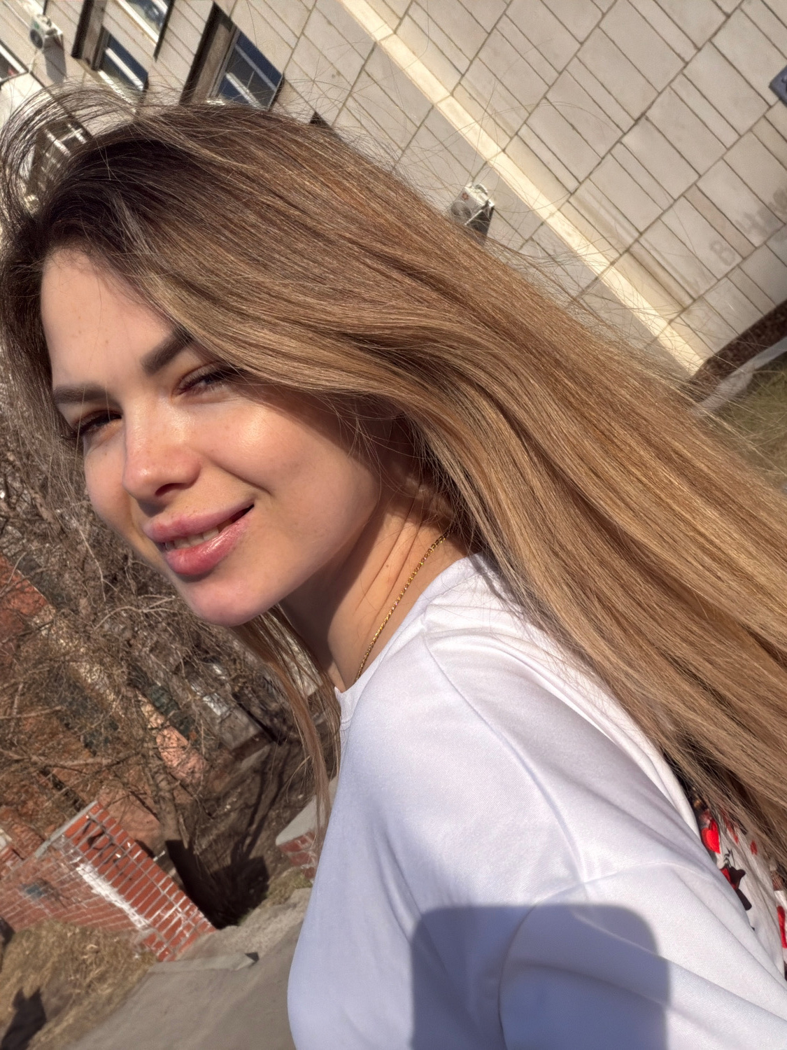 A close-up outdoor portrait, oriented sideways, features a young woman with long, straight, light brown hair. She is looking downwards with a gentle, pleasant smile. She wears a white long-sleeved top…read more