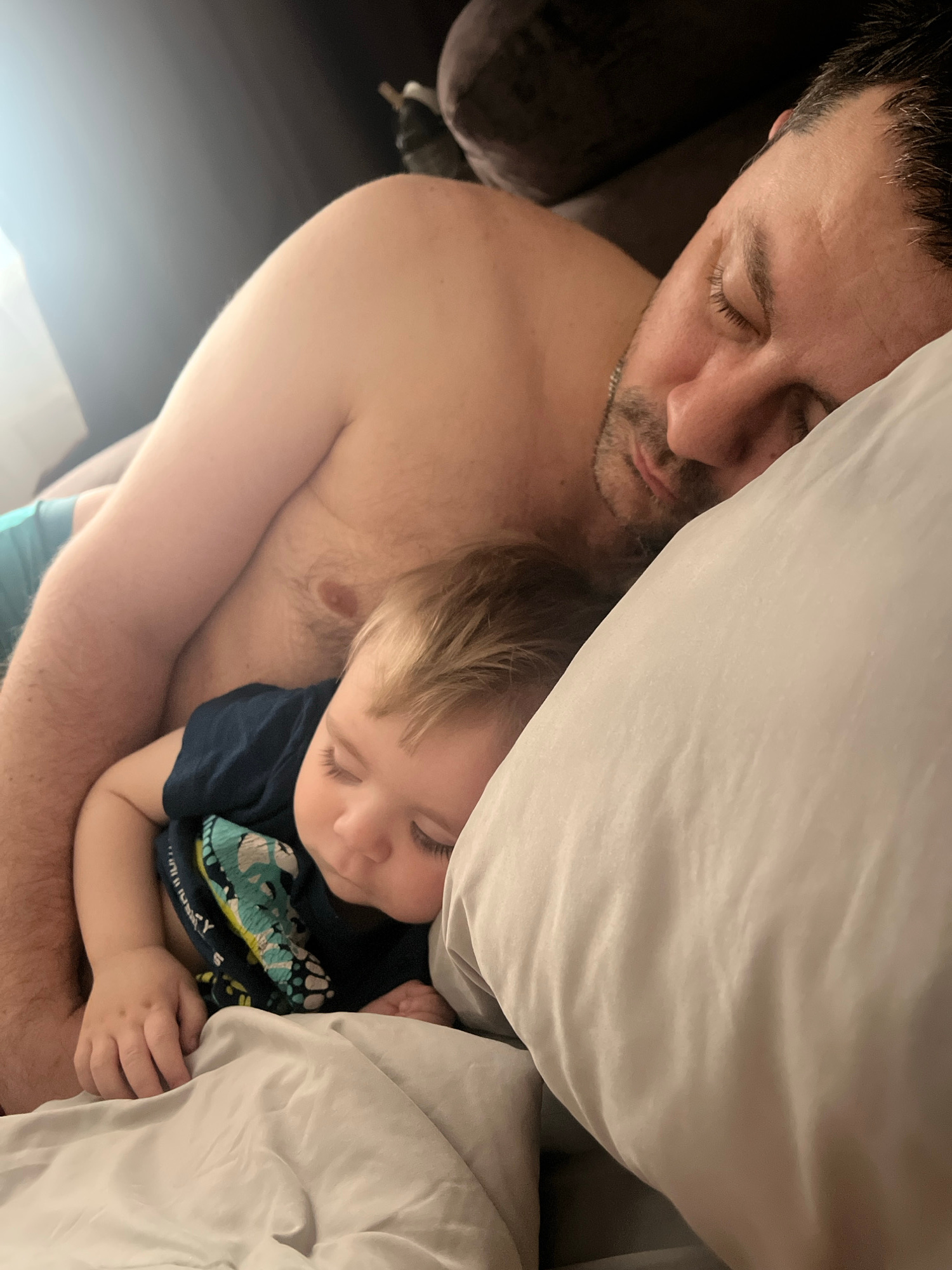 A man and a toddler are sleeping in bed. The man is fair-skinned and shirtless, with dark hair and a stubbled beard. He is lying on his side, facing the camera, with his eyes closed. The toddler is ne…read more