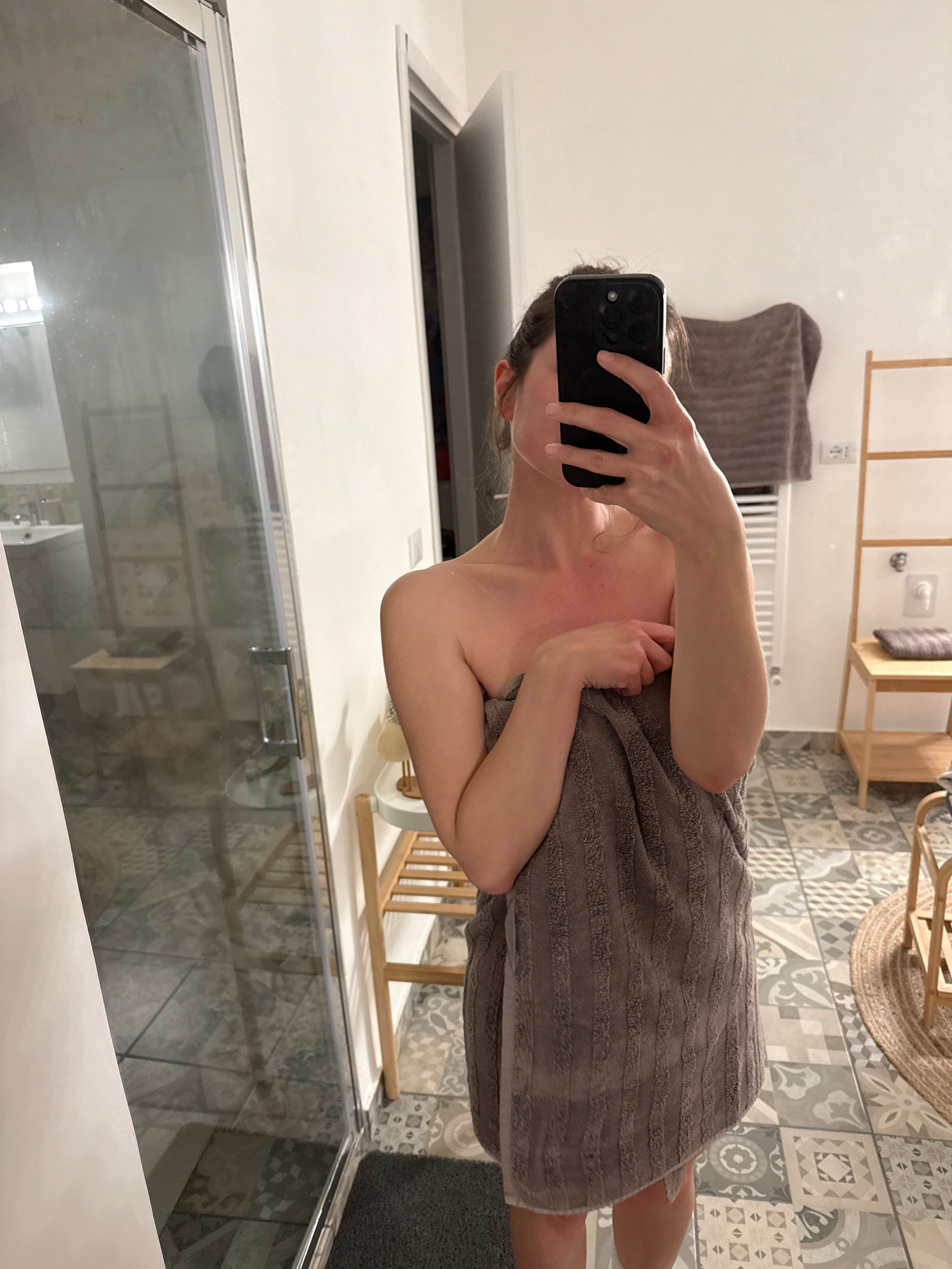 A person is taking a selfie in a bathroom. The person is holding a black smartphone, obscuring their face. They are wrapped in a gray towel. The bathroom features a glass shower door, patterned floor…read more