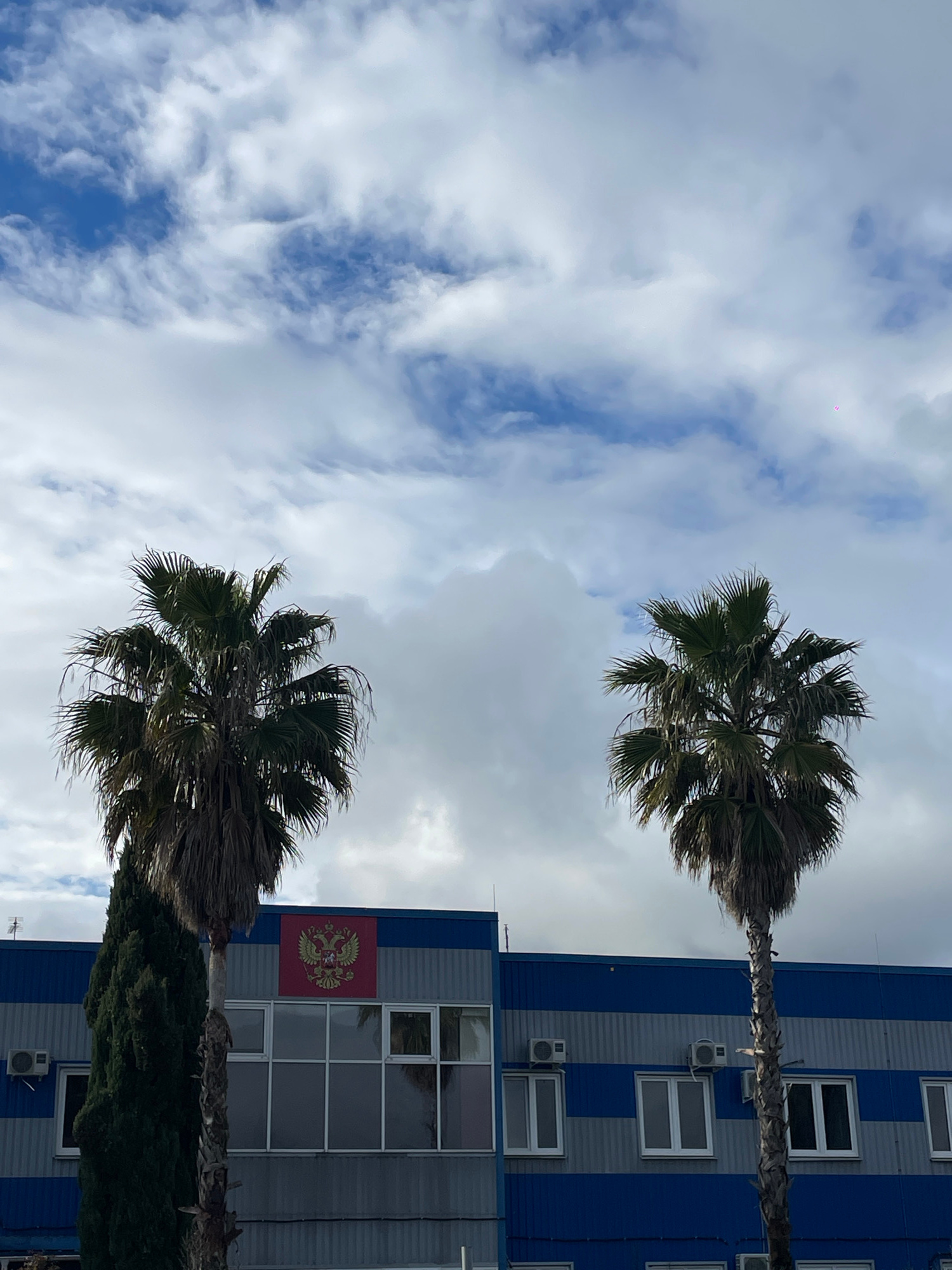 The image depicts two palm trees against a sky with scattered clouds. A multi-story building with blue and grey horizontal stripes stands to the right. Windows and air conditioning units are visible o…read more