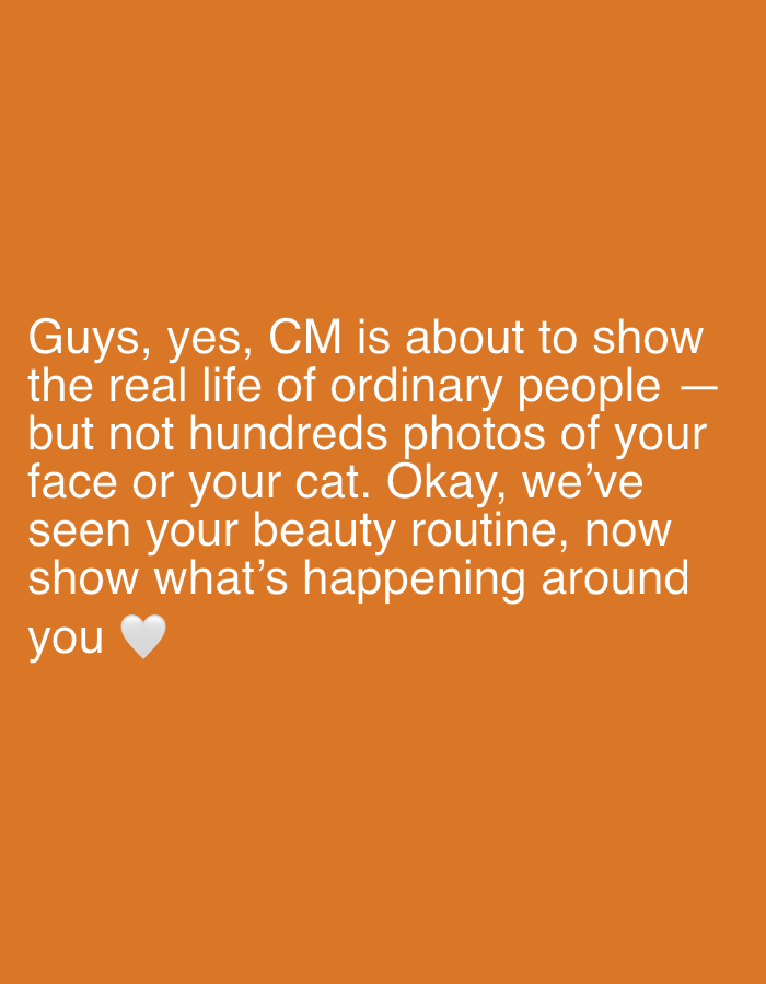 The image displays white text superimposed on a solid, untextured orange background. The text reads: "Guys, yes, CM is about to show the real life of ordinary people — but not hundreds photos of your…read more