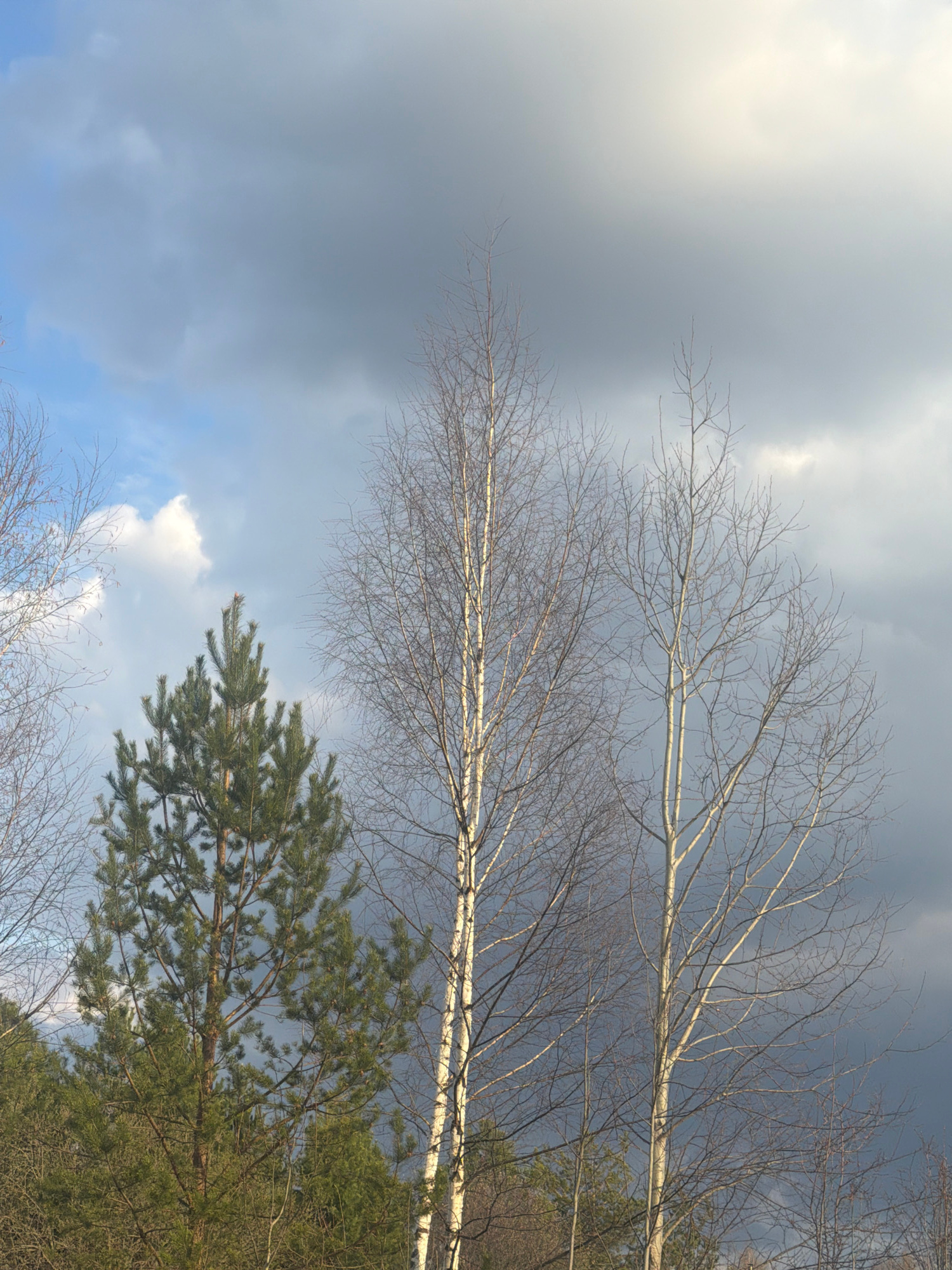 The image shows a view looking up at trees against a cloudy sky. Two birch trees with bare branches are prominent. A coniferous tree with green needles is also visible. The sky is a mix of light blue…read more