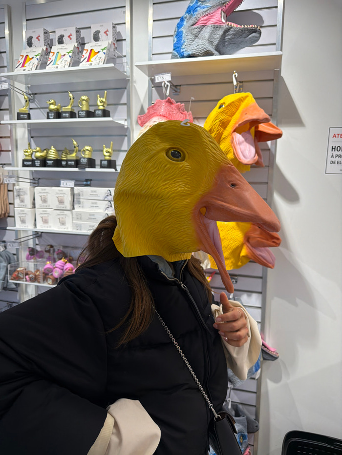 A person wears a yellow dinosaur mask with a brown beak in a store. The person is wearing a black puffer jacket and a light-colored sweater. The store shelves are stocked with dinosaur masks, figurineβ¦read more