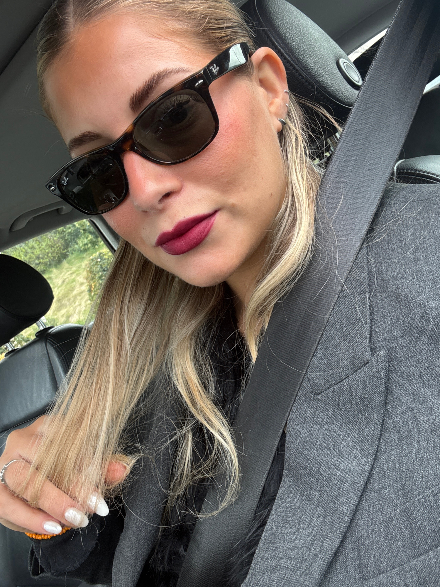 A blonde woman wearing dark sunglasses and dark red lipstick is in a car. She is wearing a gray suit jacket and a seatbelt. The location cannot be verified.