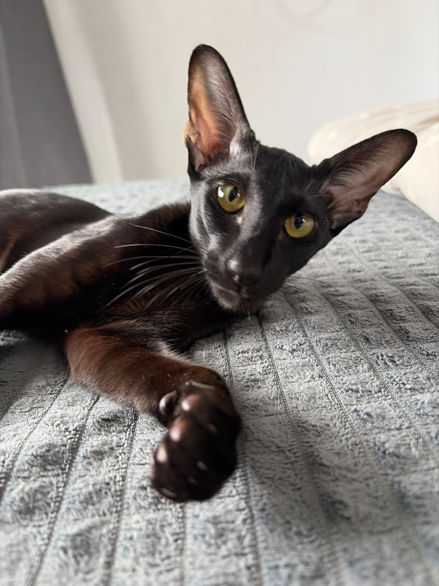 A dark brown oriental shorthair cat with large ears and green eyes is clinging to a gray, textured surface, possibly a wall or furniture. The cat is looking at the camera with its head tilted. The bac…read more