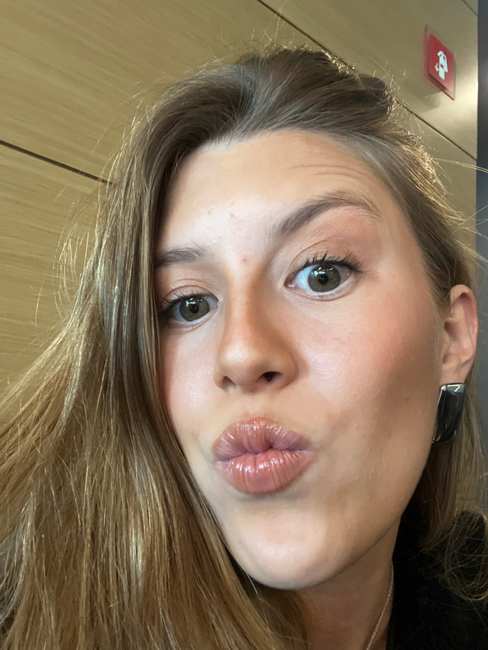 A woman poses close-up with glossy lips and slightly puckered. Her eyes are wide, framed by light eyebrows and lashes. Her blond hair falls around her face. She wears a silver earring. The background…read more
