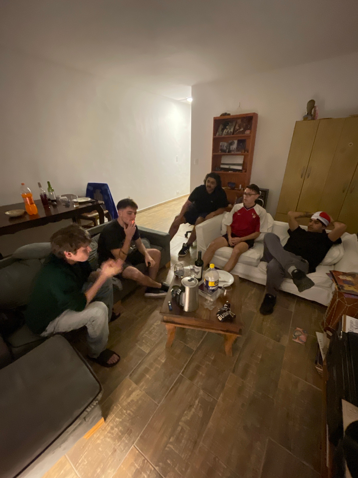 An informal gathering of at least six young men is depicted in an indoor setting, likely a living room, at night or in the evening. The photograph is taken from a high angle and rotated, suggesting a…read more