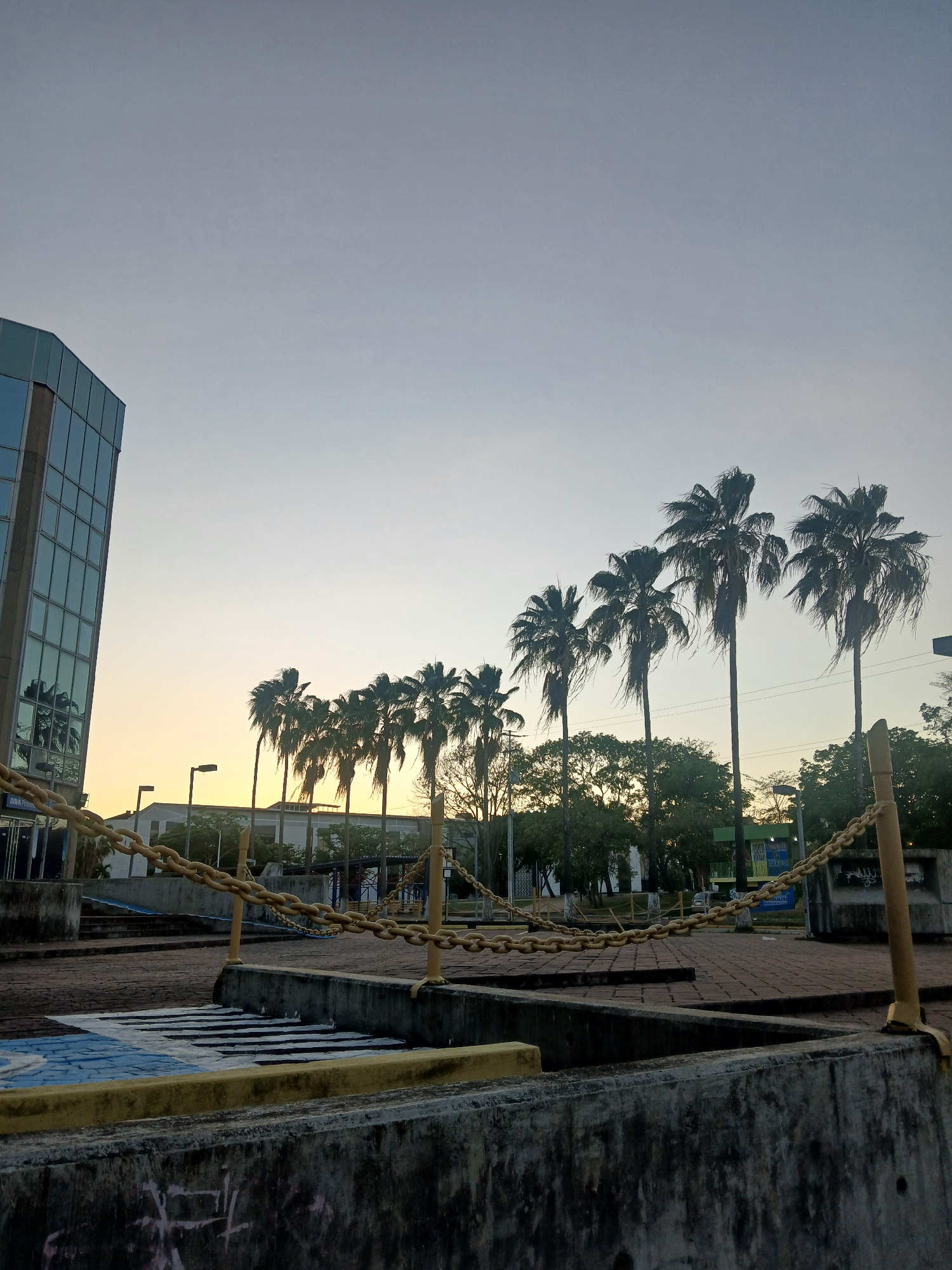 Here is a detailed description of the image: The image depicts a row of palm trees lining a walkway or promenade in Ciudad Guayana, Venezuela, based on the location in the query. The scene is taken f…read more