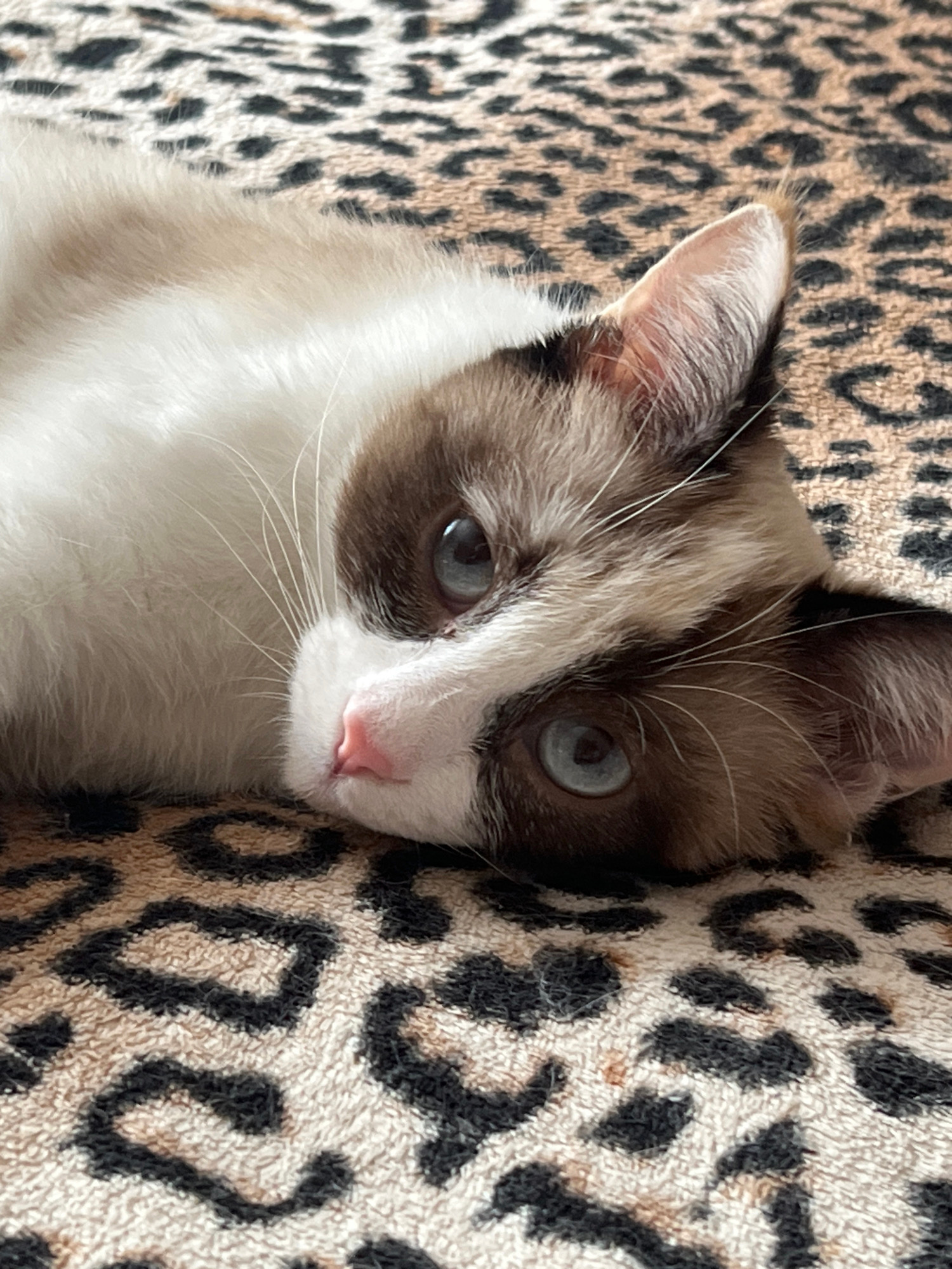 A domestic cat is lying on its side on a patterned fabric. The cat has predominantly white fur with brown markings around its eyes and a pink nose. The fabric beneath the cat has a leopard-print patte…read more