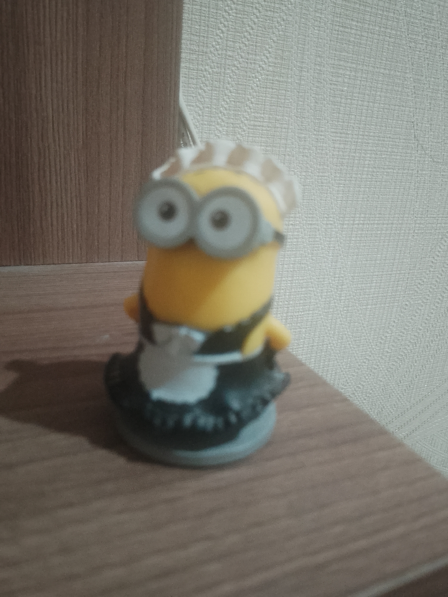 The image shows a plastic toy Minion figure dressed as a maid. The figure is yellow with gray goggles and is wearing a white frilly cap, a white bib, and a black dress with a frilly edge. It stands on…read more