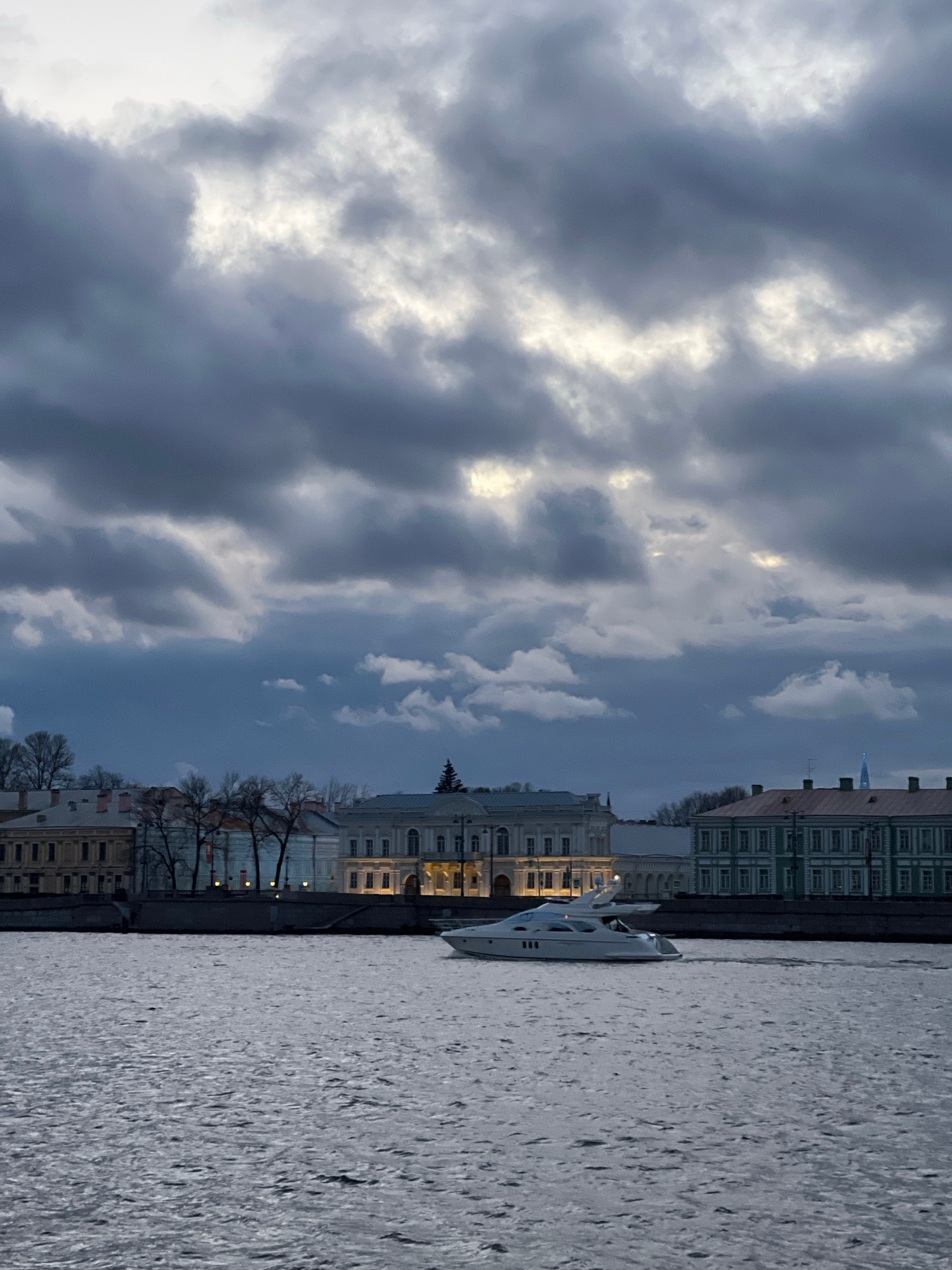 The image depicts a cityscape in Saint Petersburg, Russia, under a cloudy sky. A body of water, likely a river or canal, fills the foreground. A yacht is docked along the embankment. Buildings line th…read more