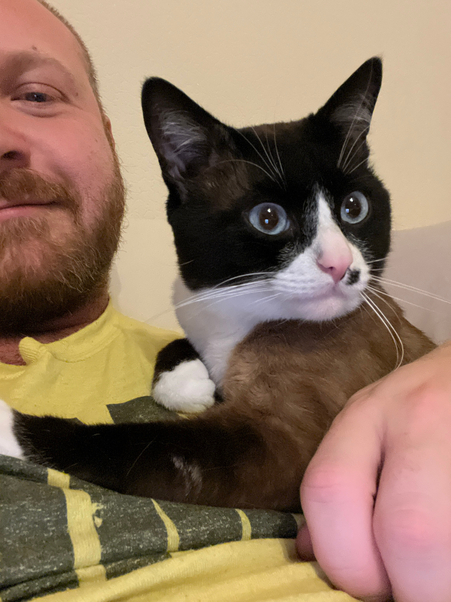 A close-up, slightly tilted shot depicts a man holding a black and white cat. The man has fair skin, a reddish beard, and is wearing a yellow shirt with a dark green and yellow stripe pattern. The cat…read more