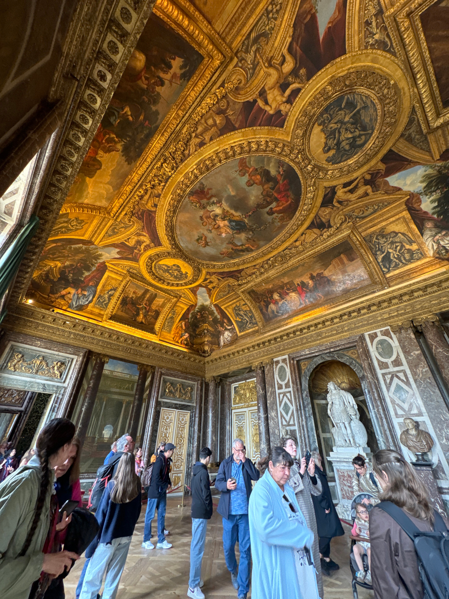 The image shows the Hall of Mirrors in the Palace of Versailles, located in Versailles, France. The elaborately decorated ceiling is covered in paintings and ornate gold details. A line of tourists st…read more