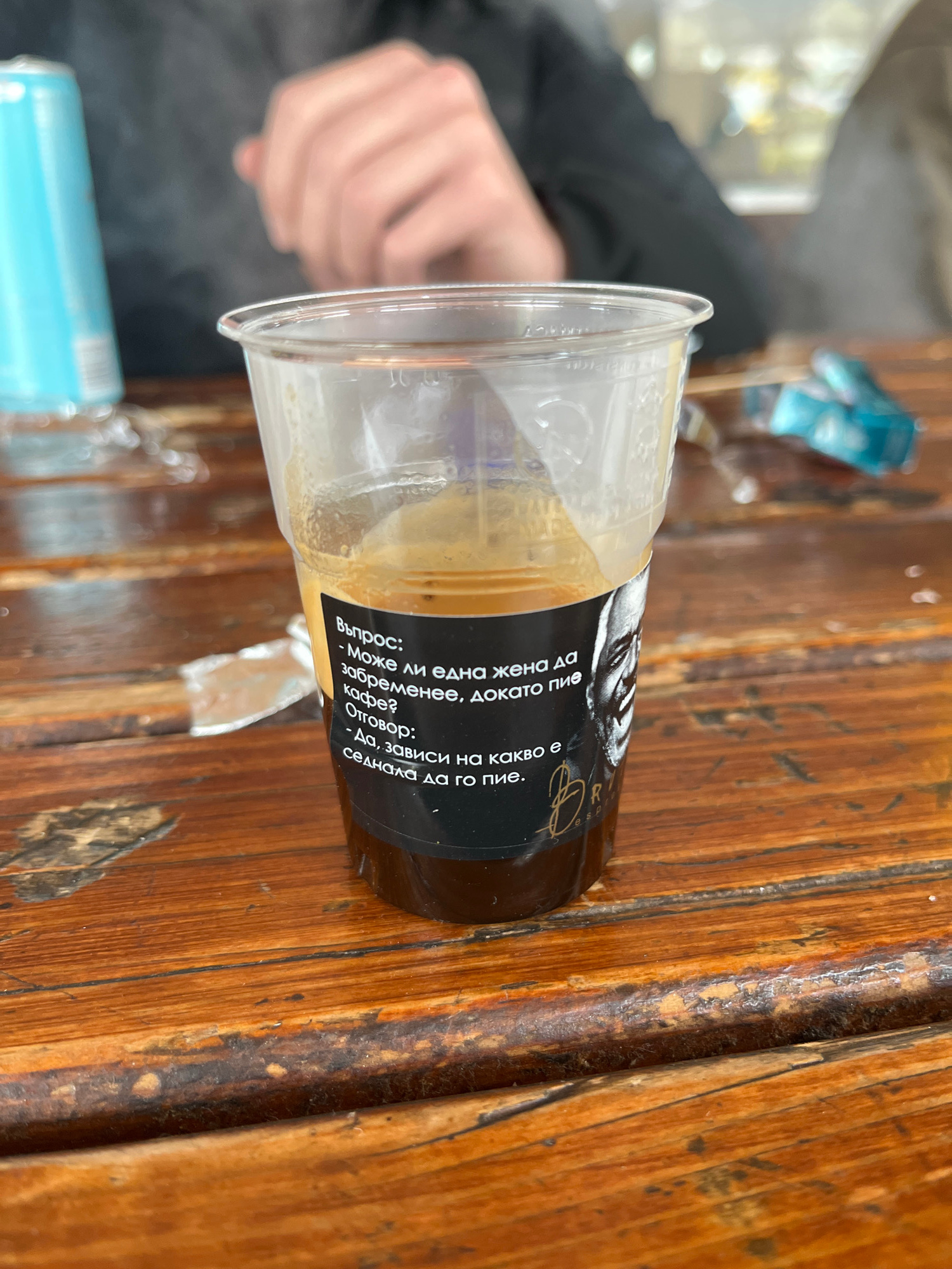 A plastic cup containing coffee sits on a wooden table. The cup has a black label with white text written in Bulgarian. The text translates to "Question: Can a woman get pregnant while drinking coffee…read more