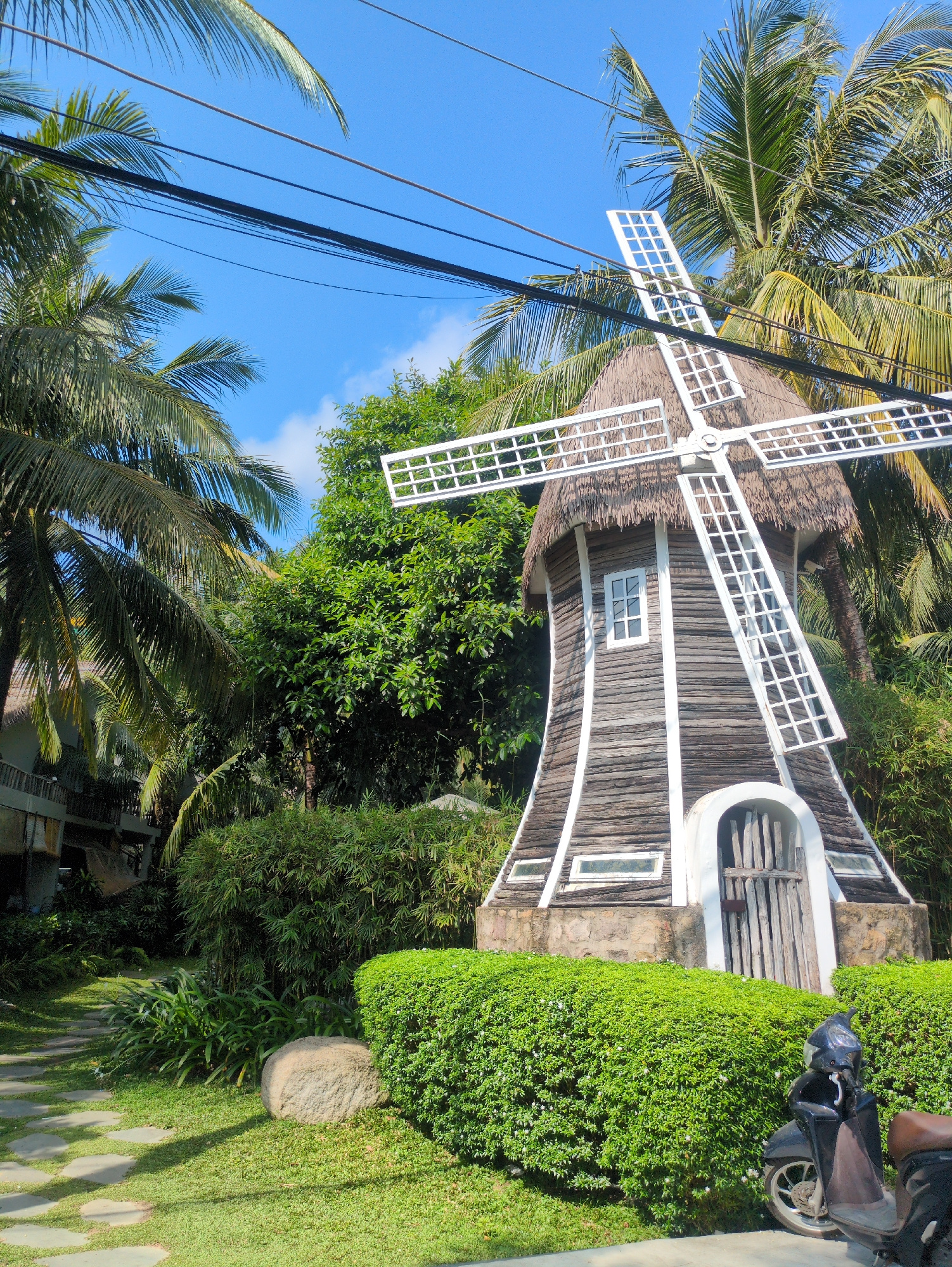 The image shows a thatched-roof windmill in Phú Quốc, Vietnam. The windmill has four white blades, a dark wood exterior with white trim, and a small window. A decorative archway is visible on one side…read more