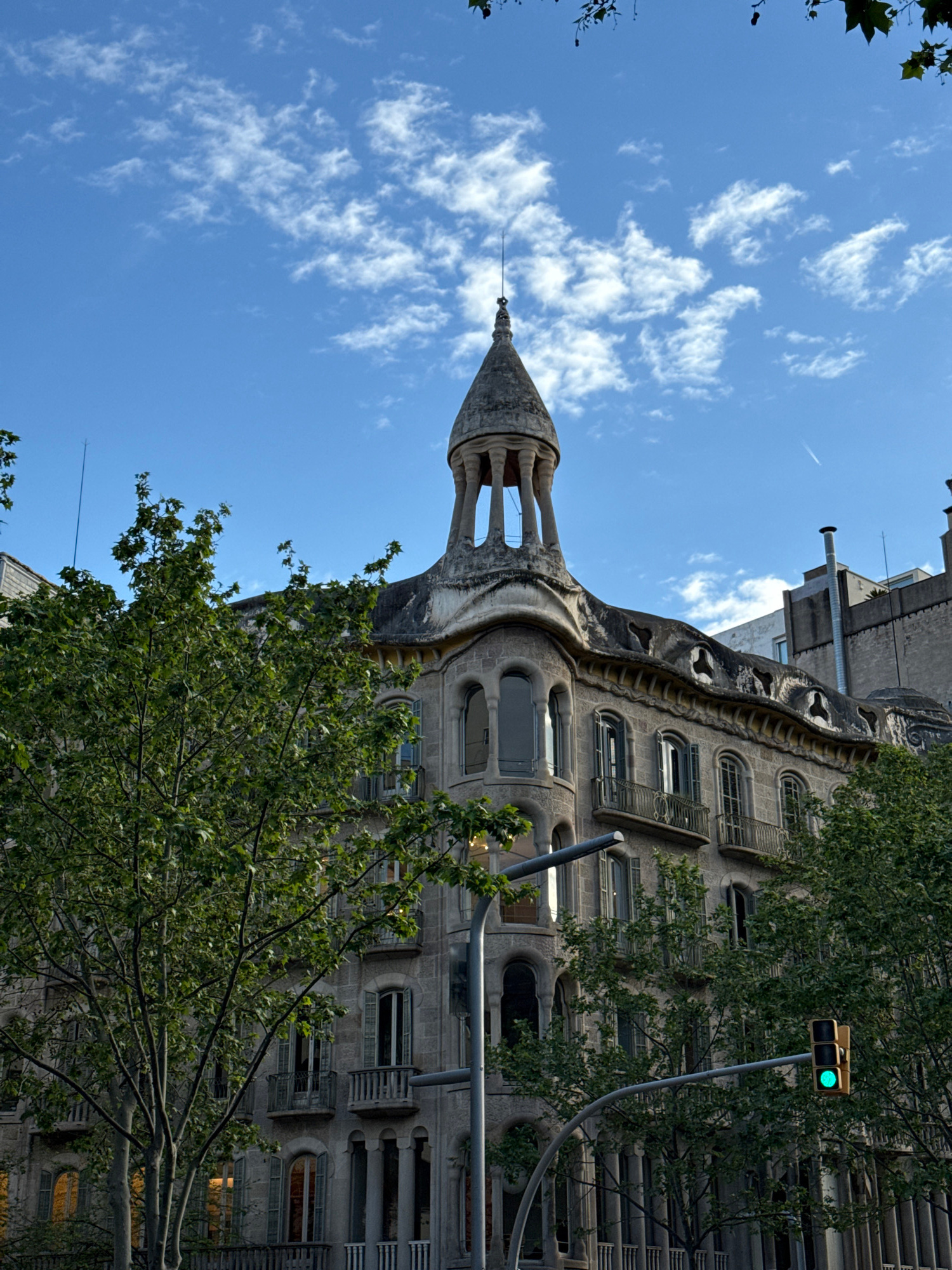The image shows Casa Batlló, a building in Barcelona, Spain, designed by Antoni Gaudí. The view is from below, looking up at the building's distinctive facade. The structure features an organic, bone-…read more