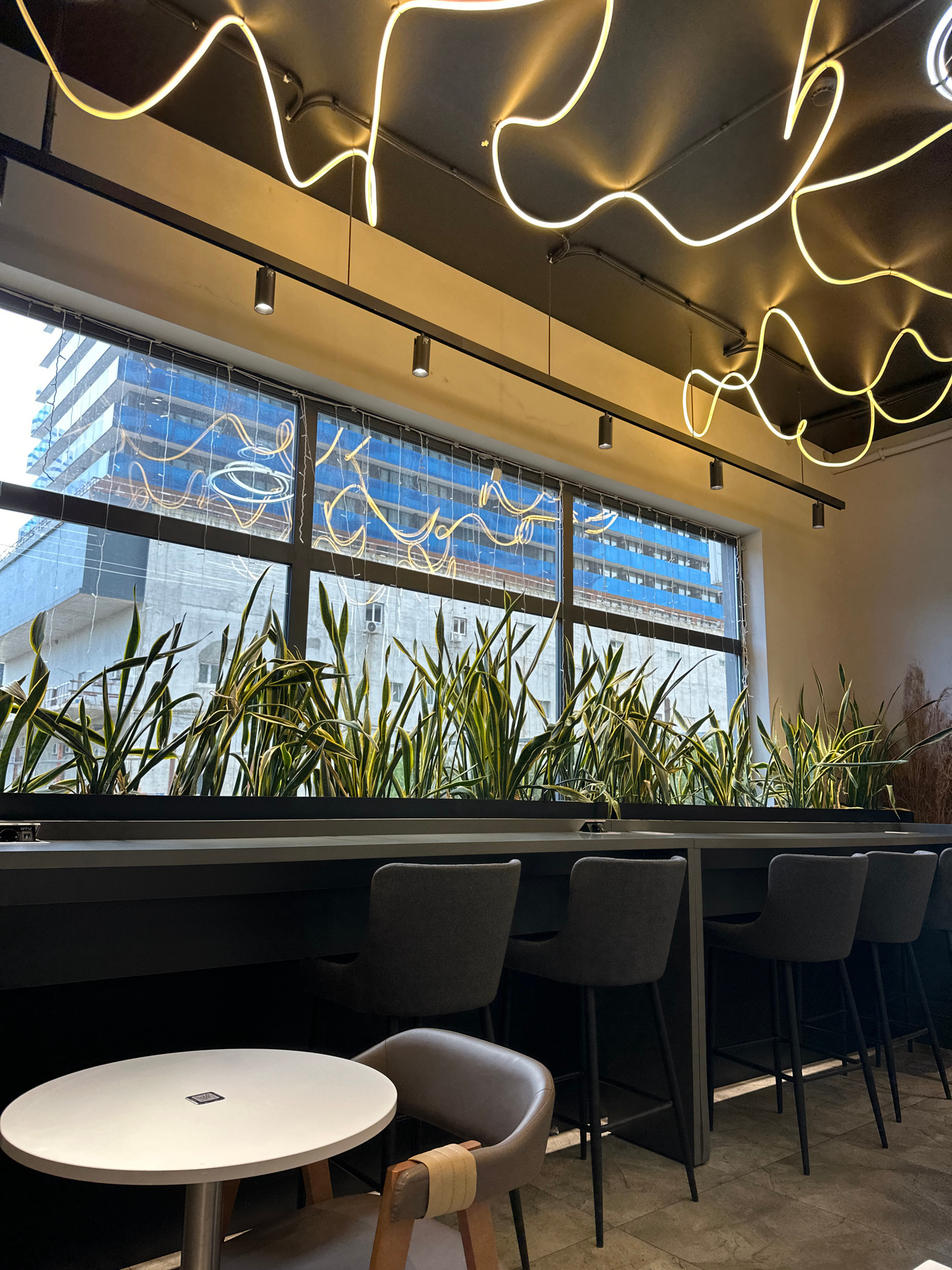 The interior of a modern-styled space, possibly a cafe or restaurant, features a high, angled window offering a cityscape view, likely in Batumi, Georgia, given the architectural style. A large, whims…read more