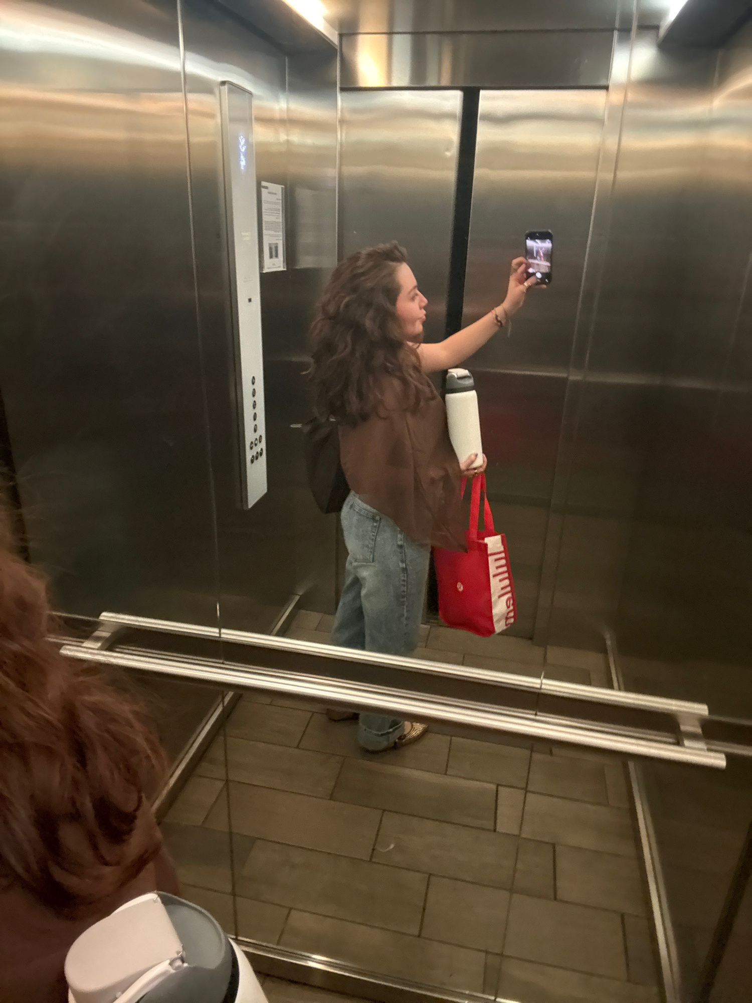 A woman with curly brown hair is taking a selfie in an elevator. She is wearing a brown jacket and blue jeans. She is holding a cell phone in her right hand. She is also holding a water bottle and a r…read more