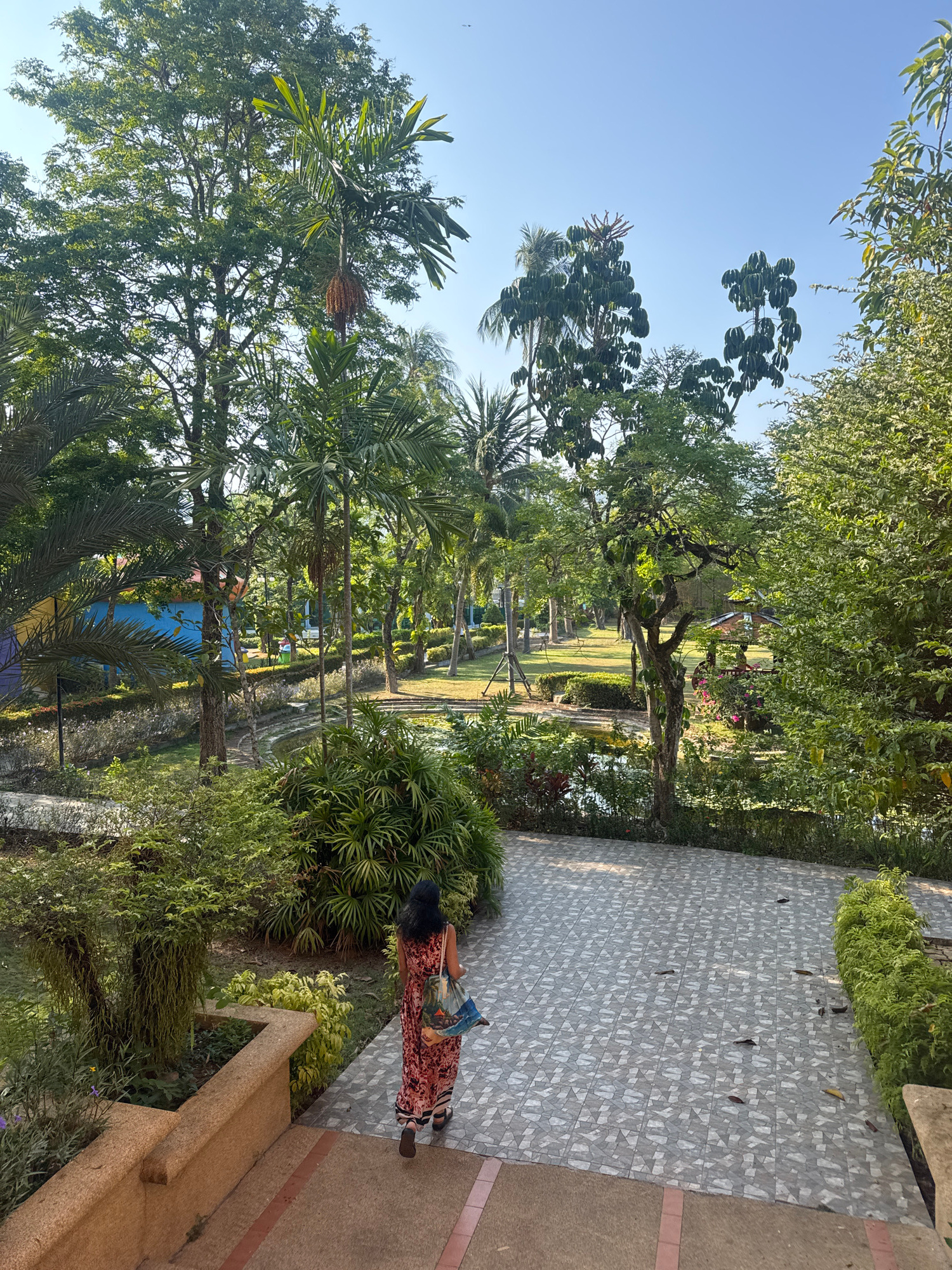 The image shows a person in a long, red patterned dress walking along a gray paved walkway in Patong, Thailand. The walkway is bordered by lush greenery, including trees and bushes. In the background,…read more