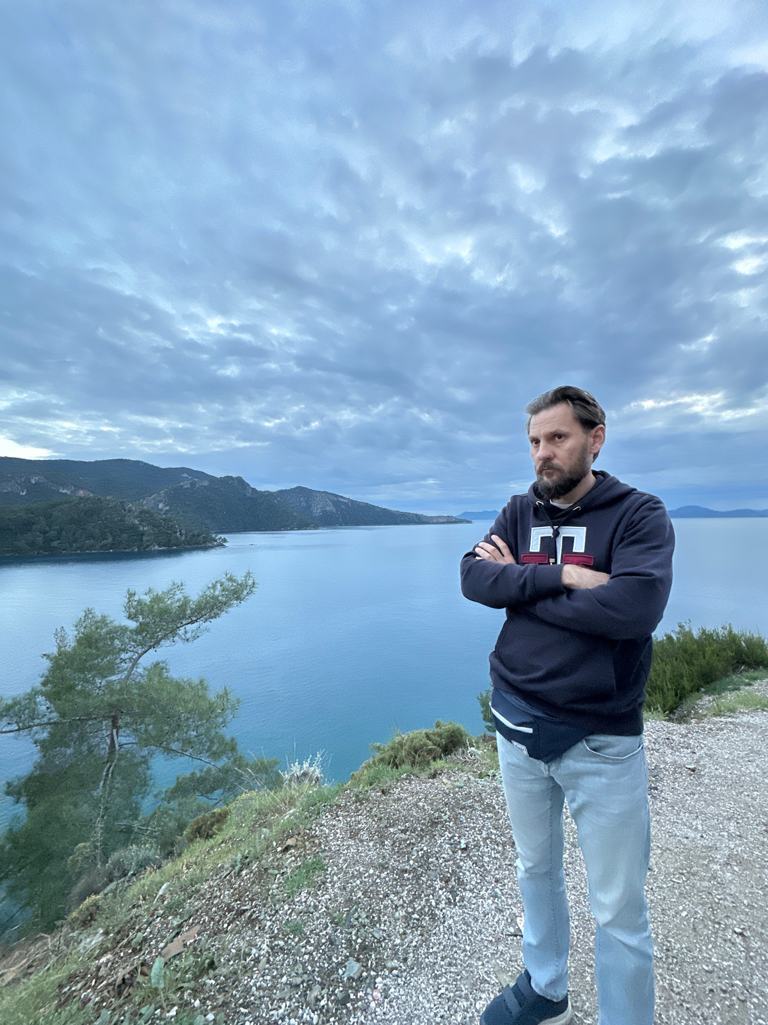 A medium shot captures a man standing on a gravel path with crossed arms. He is wearing a navy blue hoodie with a white and burgundy design on the chest and light blue jeans. The man has a beard and i…read more