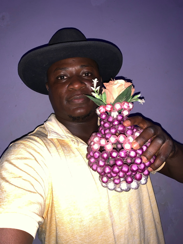 A man with dark skin and a black hat is seen lying on his side. He wears a pale yellow shirt and has a small beard. He holds a sphere made of pink and purple beads in his hand. The sphere also contain…read more