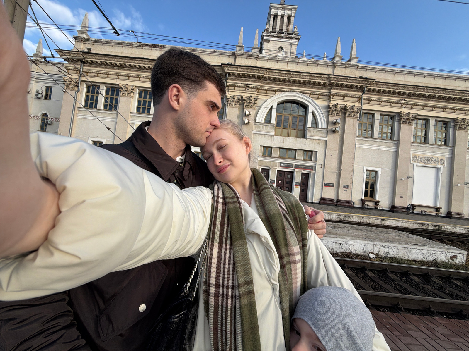 A man and a woman are shown in a close-up selfie. The man is kissing the woman on the cheek. The woman has light skin, and she is wearing a gray hat, a beige jacket, and a plaid scarf. The man has dar…read more