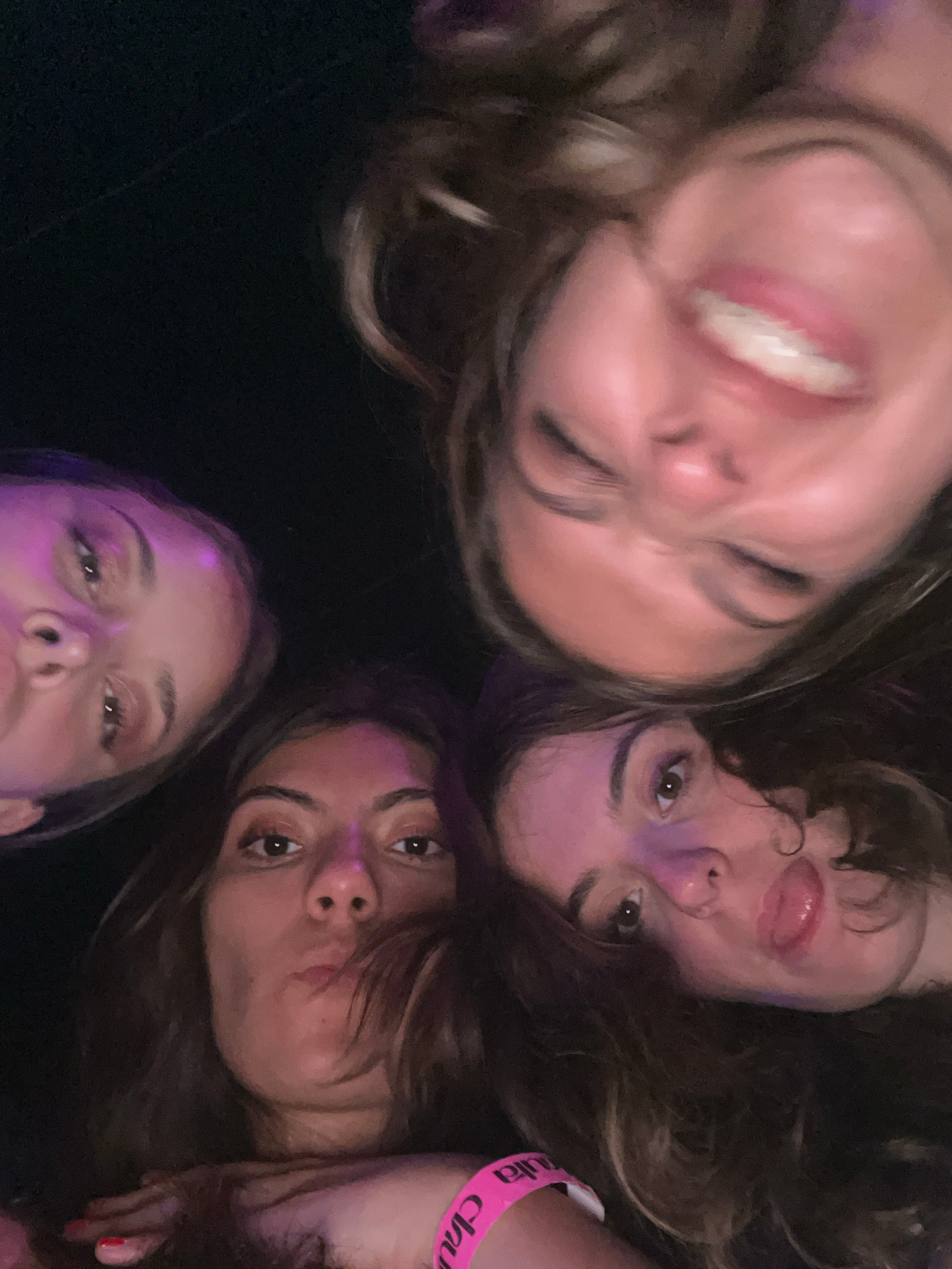Four young women are crowded closely together, their faces dominating the frame. The perspective is from above, looking down at them. One woman, positioned at the top left, is smiling widely, revealin…read more