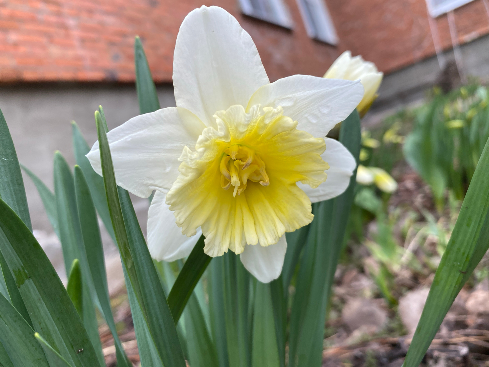 A close-up outdoor shot features a vibrant white and yellow daffodil (Narcissus) in full bloom, positioned centrally in the frame. The flower exhibits pristine white outer petals (perianth) and a prom…read more